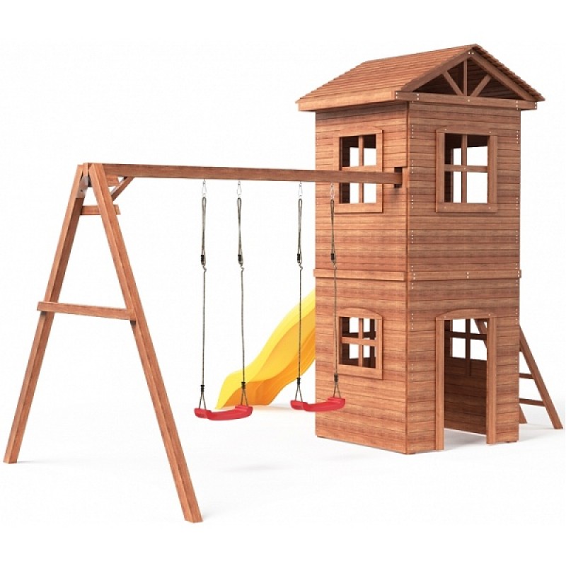 Призначена для дітей від 4 до 15 років. Силові деталі виконані з лісоматеріалів листяних і хвойних порід. значно економить Ваш простір.Комплектація:Вежа з дерев'яним дахом; Дерев'яні гойдалки; Підвісна гойдалка Човен - 2 шт; (можна замінити на будь-яку гойдалку, наприклад, 3 в 1 або гніздо) Вузький скеледром; Гірка пластикова 285 см експлуатується цілий рік, оснащена бортиком, довговічна, надійна; Дах дерев'яний; Пісочниця під вежею; Матеріали стандарти якості та безпекаПлоща виготовляється з лісоматеріалів листяних та хвойних порід. Матеріал має природну деревну текстуру, оброблений спеціальними складами для більшого терміну використання та запобігання руйнуванню деревини. Всі елементи проходять попереднє шліфування - Ваша дитина ніколи не отримає задирки. Невелика кількість металевих елементів значно виключає можливість отримання дитиною травм. якості - виробництво Голландія, Польща, Китай. Розміри та вага комплексу Висота загальна - 326 см; Висота від землі до підлоги – 150 см; Ширина загальна – 430 см; Ширина від вежі до гірки – 308 см; Довжина загальна – 490 см; Довжина від гойдалки до вежі – 412 см; Загальна вага: 350 кг;