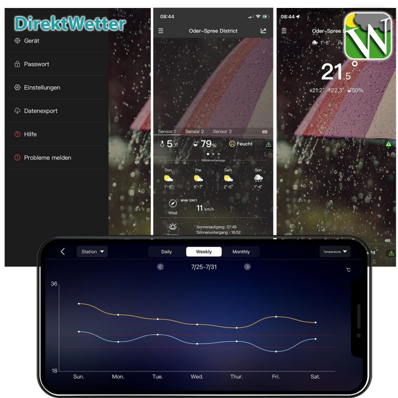 З інноваційною технологією DirektWetter, ця станція може отримувати регіональні прогнози погоди, підготовлені професійними метеорологами. При першому підключенні до додатка, метеостанція отримує данні про місцезнаходження за допомогою геолокоції телефону, орієнтуючись на найбільший населений пункт в межах 5 км, і в подальшому використовує ці дані для відображення прогнозу погоди для вашого населеного пункту, місцевого часу, часу сходу і заходу сонця в будь-якій точці України, де є мережа Інтернет. Крім того, місцева зовнішня температура передається на базову станцію за допомогою радіопередавача з частотою 868 МГц і радіусом дії до 50 метрів. Це дає вам повну картину поточної та майбутньої погодної ситуації.