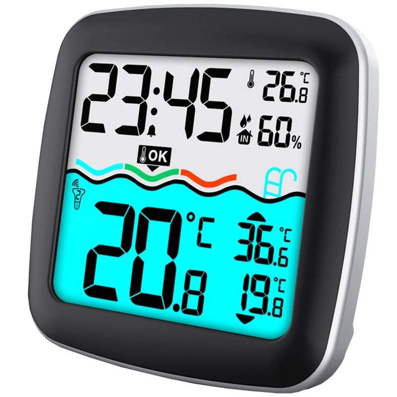 Тепер ви можете слідкувати не тільки за мікрокліматом в SPA зоні, а ще й контролювати температуру води в кількох водних зонах одночасно. Technoline WS9059 - це термогігрометр що вимірює температуру води в басейні і може підтримувати до 3-х бездротових датчиків одночасно. Датчик водонепроникний і обладнаний власним екраном для выдображення температури води. Він може передавати данні на відстань до 60 метрів за допомогою радіосигналу на основний блок, встановлений у приміщенні. При цьому основний блок також вимірює внутрішню температуру, вологість і показує мінімальні і максимальні значення цих параметрів, та додатково обладнаний годинником з будильником.
