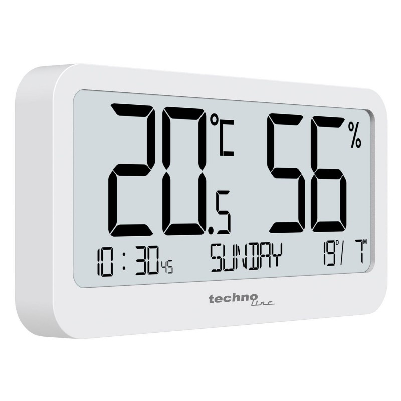 Technoline WS9455 White це термогігрометр з мінімалістичним дизайном, годинником і календарем. Його особливістю є можливість перемикання відображення годинника або температури і вологості на основному екрані великими цифрами, а додаткові данні будуть відображатися внизу екрана. Термогігрометр може кріпитися на стіну, встановлюватися на горизонтальну поверхню та може кріпитися на сталеві поверхні за допомогою вбудованих магнітів. Також в комплекті є самоклеюче кріплення для місць, де не можливо просвердлити отвір.