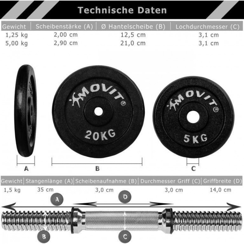 Вам більше не доведеться платити за дорогі відвідування фітнес-центрів, з цими гантелями ви зможете з легкістю тренувати все тіло. Набір гантелей Movit Pro дуже компактний, тому не займає багато місця. Оснащені неслизькою ручкою, яка забезпечує надійне захоплення під час зміцнення. Поперечні канавки на ручці забезпечують легкий хват. Для кращого орієнтування на вазі нанесена шкала.
