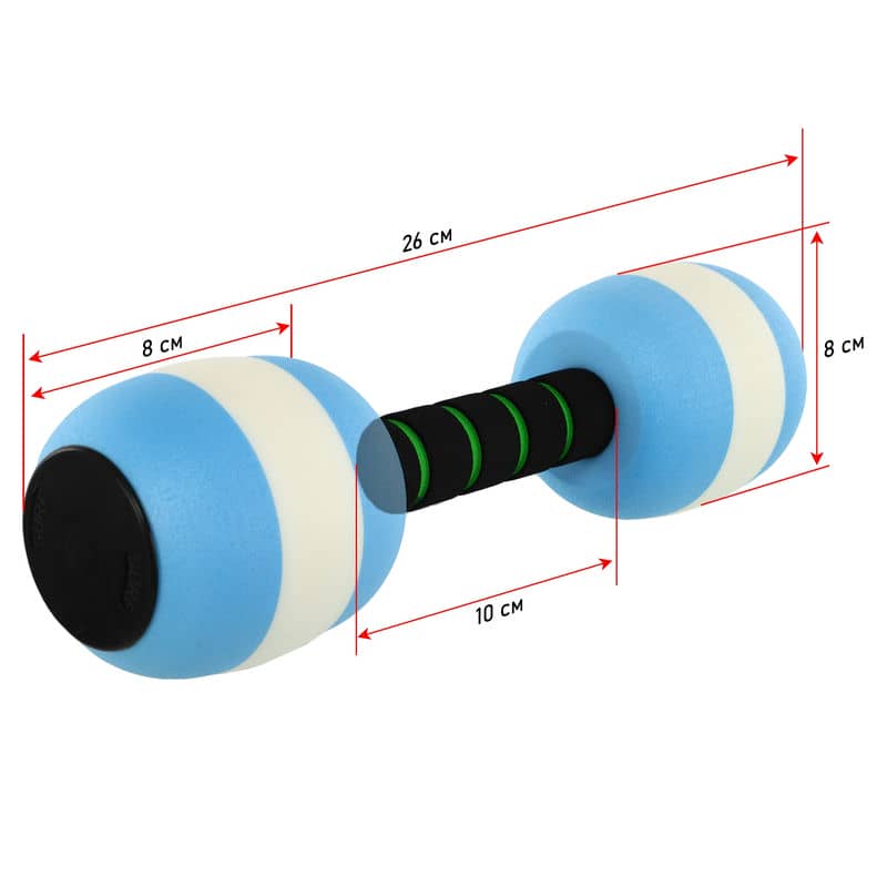 Гантелі мають оптимальні розміри для аквааеробіки: довжина становить 26 см, а діаметр – 8 см, що забезпечує зручність у використанні та дозволяє легко керувати інвентарем у воді. Виготовлені з етиленвінілацетату (EVA), вони відрізняються високою міцністю та довговічністю. EVA – це легкий та стійкий до впливу води матеріал, який не втрачає своїх властивостей при тривалому контакті з водним середовищем.