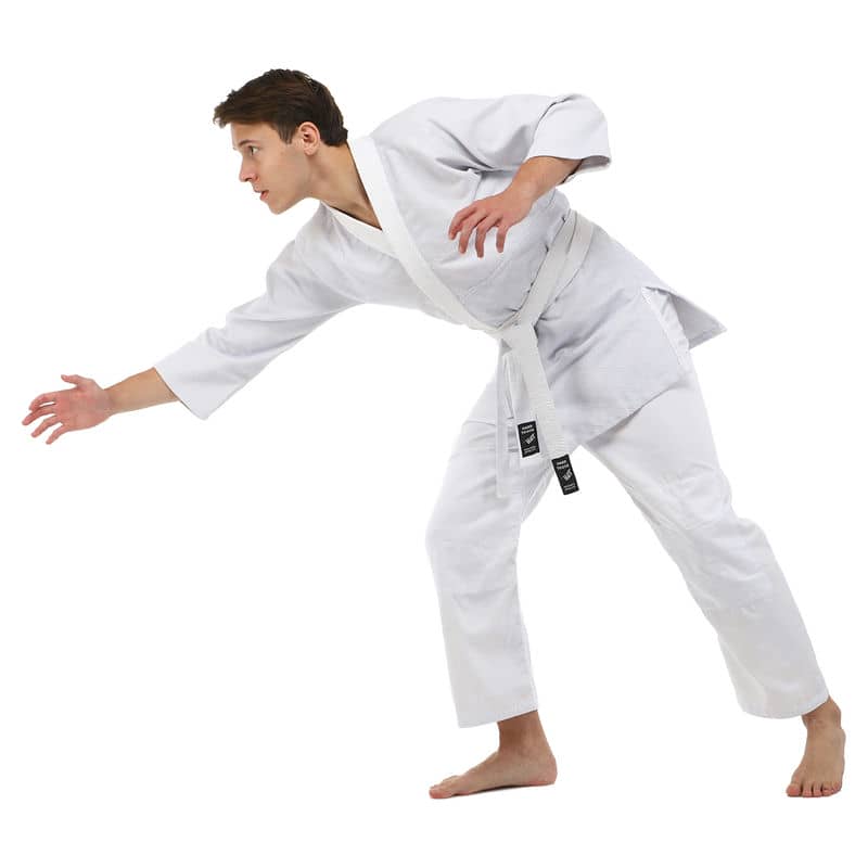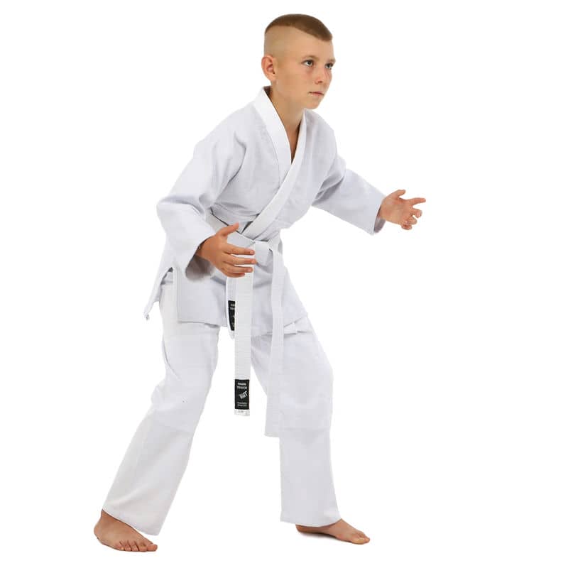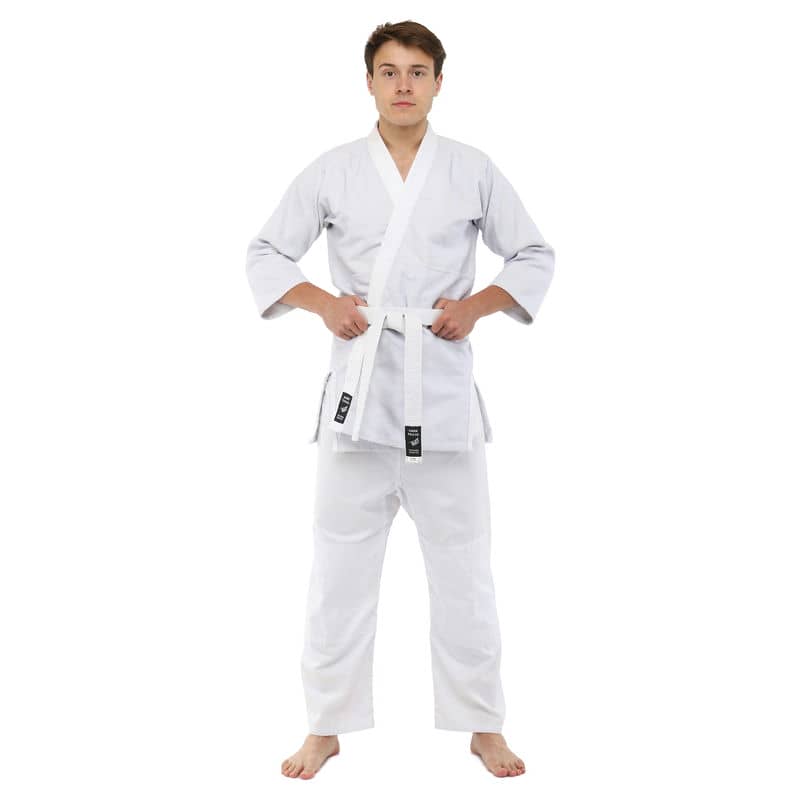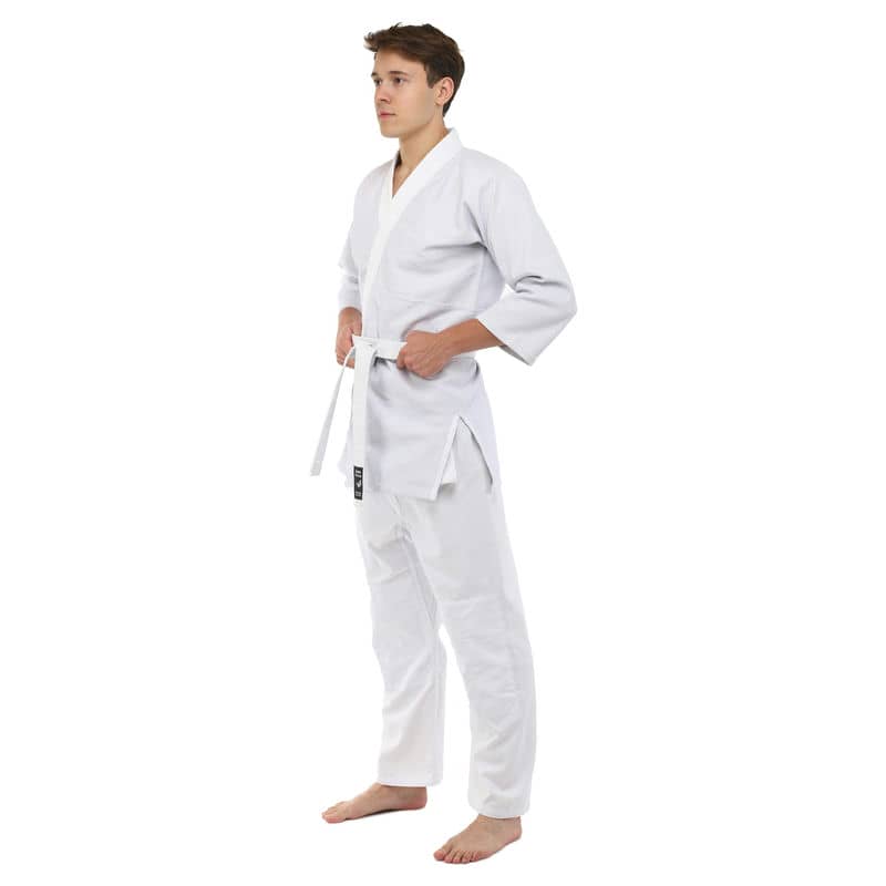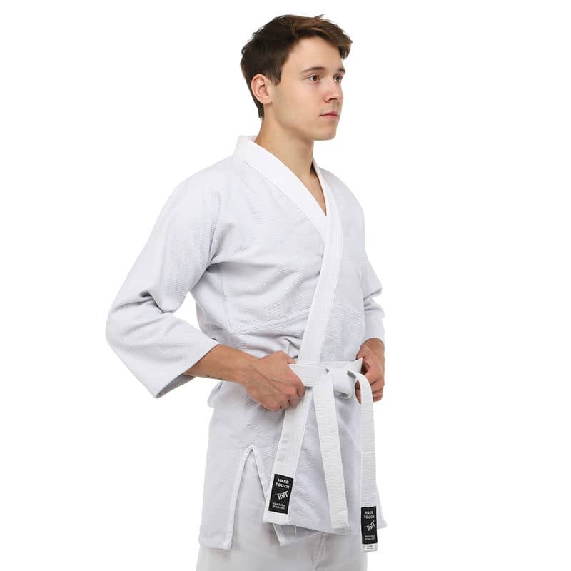 Для виготовлення кімоно використовується натуральне бавовняне волокно – з нього виготовляють тканину особливого плетіння. Вона відрізняється високою стійкістю до деформації на розрив. Посилений відворот кімоно і вставки під рукавами підвищують запас міцності.