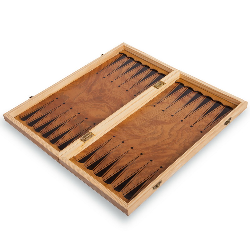 Набір складається з коробки для зберігання фігур, яка виготовлена з якісної деревини. Зовні вона є стандартною шахівницею (8 на 8 клітин), а зсередини – ndash; ігрове поле для нардів. Щоб коробка випадково не відкрилася, вона оснащена надійними замками. Для виготовлення шахових фігур та шашок також використовується деревина – світла для білих та темна для чорних. Всі дерев'яні елементи набору покриті безбарвним лаком, який захищає їх від вологи, але не приховує текстуру дерева. До набору також входять пластикові гральні кістки.