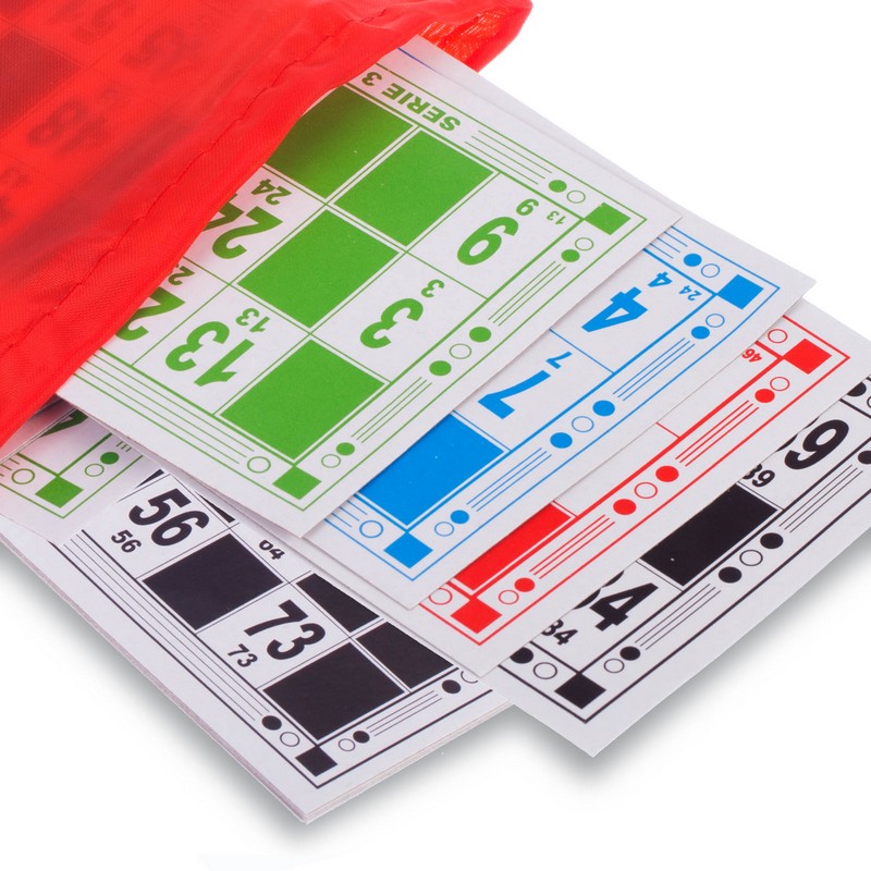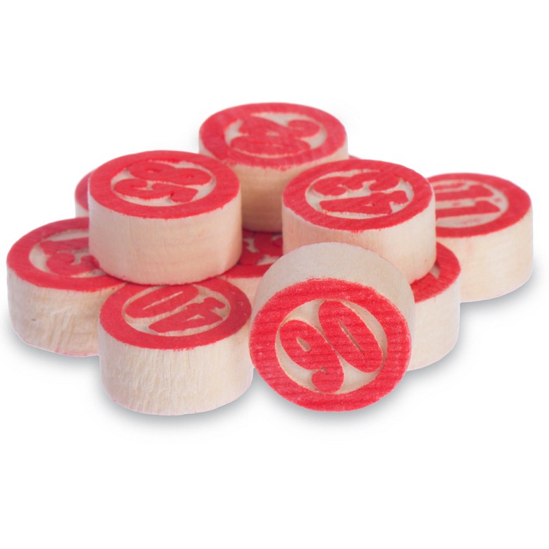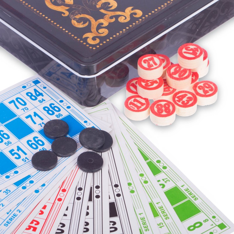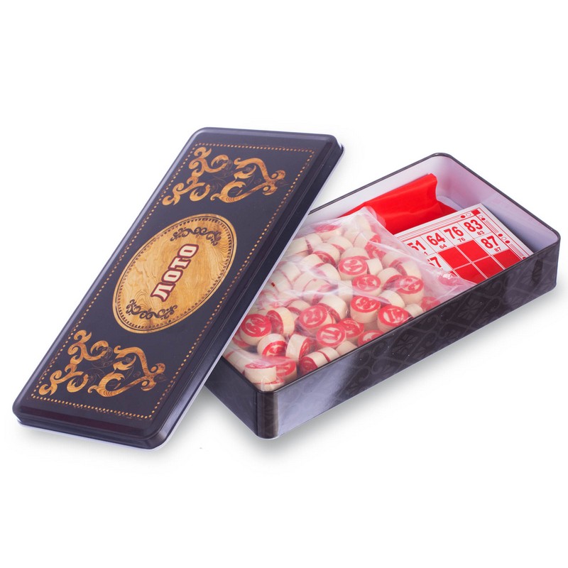 У комплект входить набір бочонок, пронумерованих від 1 до 90, які виготовлені з твердої, належним чином висушеної деревини, що гарантує їм довговічність – вони витримують серйозний механічний вплив і не розсихаються з часом. Також до нього включені спеціальні картки з ламінованого картону та пластикові фішки. Все це запаковано в красиву металеву коробку.