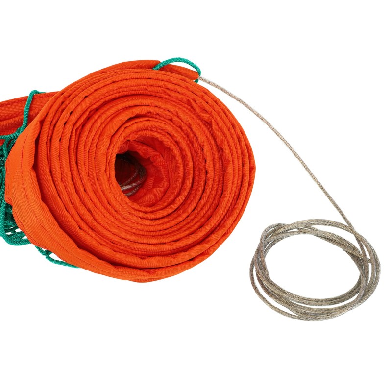Для основного натягу використовується міцний сталевий трос у пластиковій оболонці, діаметр - 4 мм. Нижнім кріпленням слугує шнур з діаметром 4 мм і довжиною 11,7 м. По всіх 4-х сторонах сітка обшита синтетичною тканиною помаранчевого кольору з поліпшеними характеристиками шириною 7 см. З метою підвищення зносостійкості та довговічності виробу, по верхньому краю тканина посилена вдвічі, а по кутах вшита щільна і міцна буксирувальна стрічка. Завдяки цьому, проблемні місця сітки вздовж обшивки стають захищені від протирання тросом і шнурами натягу.