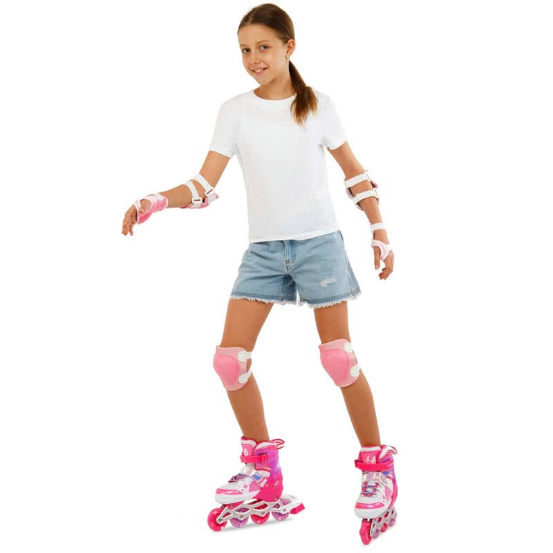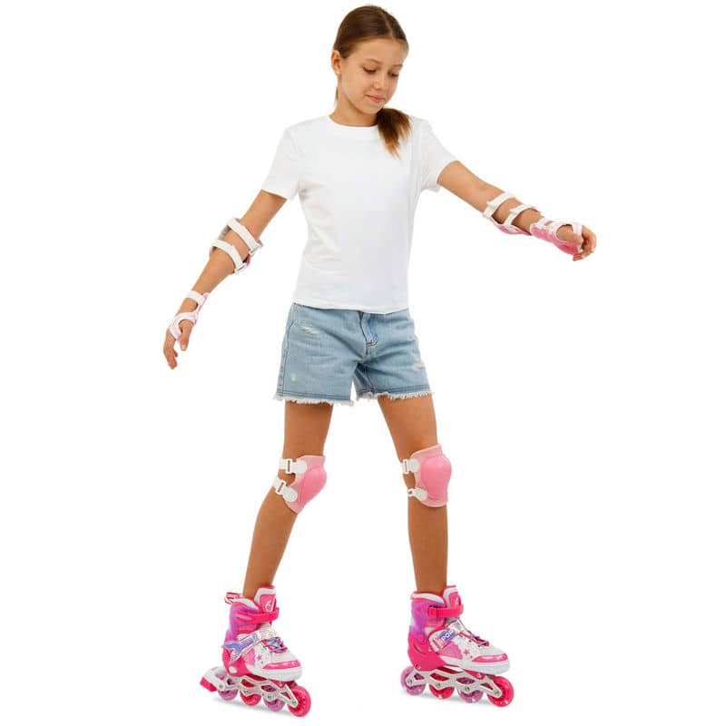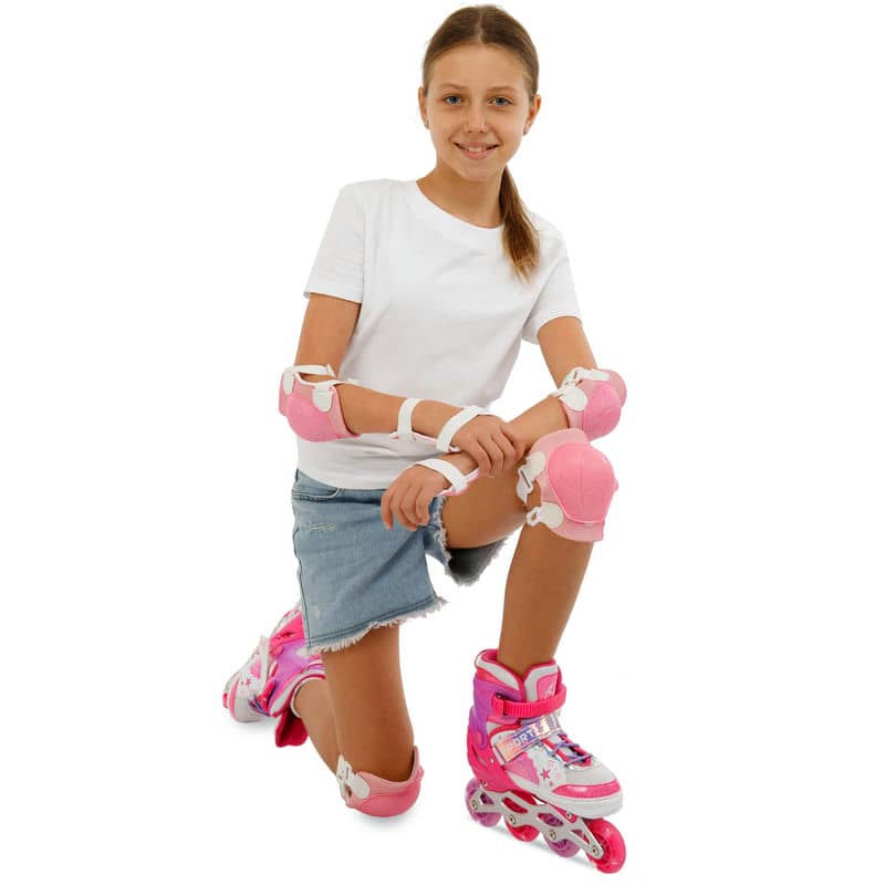 Комплект призначений для захисту найбільш уразливих частин тіла – колін, ліктів та зап'ястків – від садна, забитих місць та інших травм, які можуть виникнути при падіннях під час катання на роликових ковзанах або скейтборді.