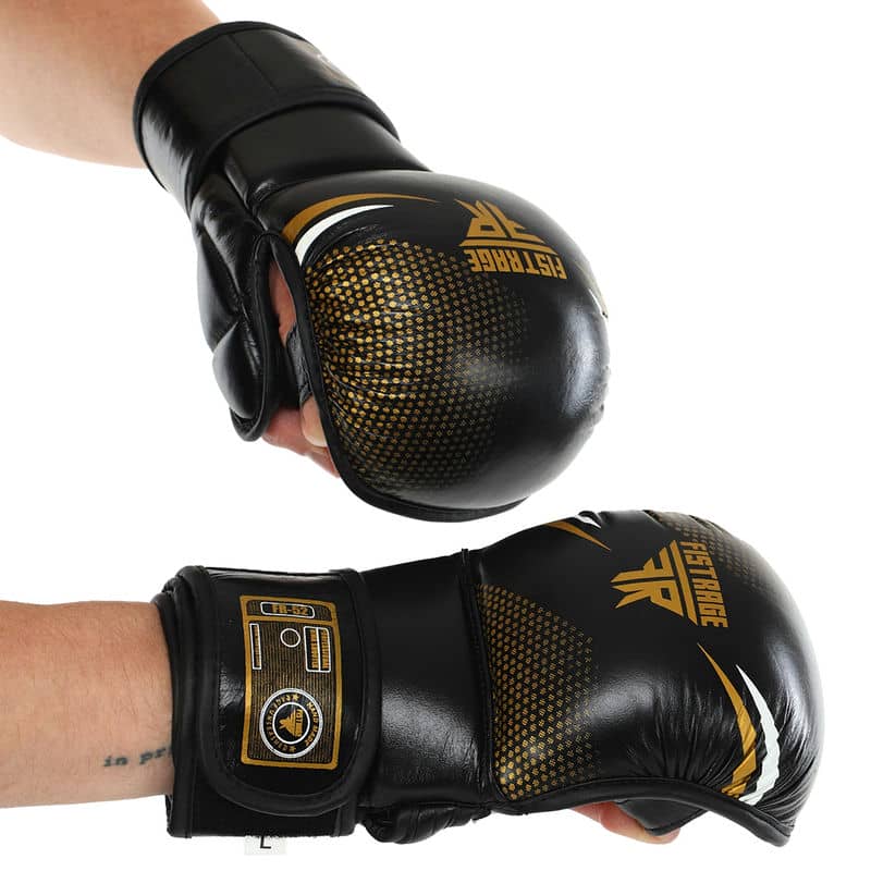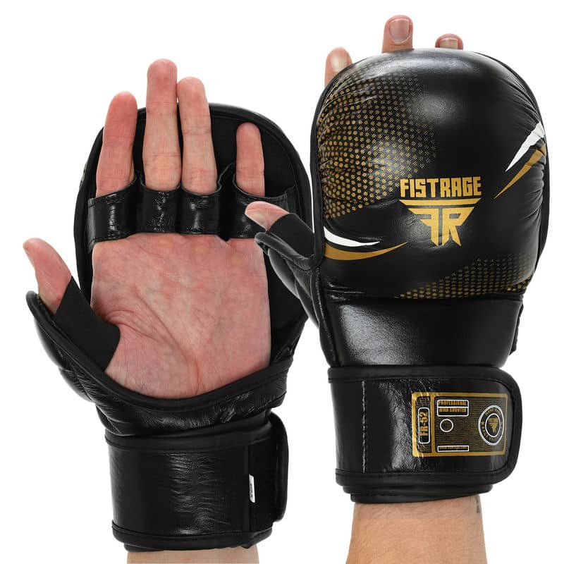 Рукавиці для змішаних єдиноборств шкіряні Fistrage розмір S, чорний-золотий, код: VL-4158_SBKG
