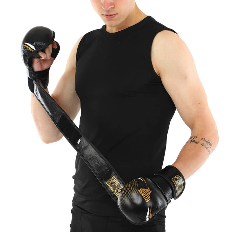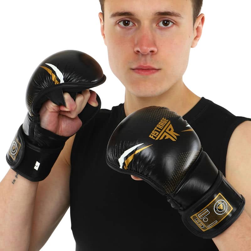 Рукавиці для змішаних єдиноборств шкіряні Fistrage розмір XL, чорний-золотий, код: VL-4158_XLBKG