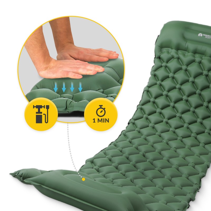 Надувний килимок від польського бренду Mountain Goat дозволить вам з комфортом провести ніч на природі. Завдяки йому ви відпочинете, встанете без болю в спині та вирушите в подорож, не відчуваючи втоми. Надувний каримат - це обов'язковий аксесуар для активних людей, яким подобається відпочинок на природі. Його можна легко взяти з собою в різні цікаві місця, наприклад: у кемпінг, скаутські та спортивні табори, пляжі та озера, багатоденні велосипедні та піші походи, фестивалі та заходи на відкритому повітрі.
