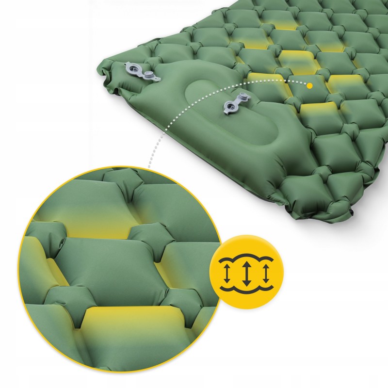 Одномісний надувний каримат від Mountain Goat відрізняється ергономічною формою та наявністю подушки для голови. Таке рішення забезпечить комфортний і приємний відпочинок навіть у складних умовах. Виріб виконаний з нейлонового матеріалу в комбінації з TPU. Це робить його не тільки приємним на дотик, але й гарантує відмінну ізоляцію від вологи та холоду. Окрім того, завдяки спеціальній структурі з окремих повітряних камер ромбовидної форми, каримат ідеально припасовується до фігури людини. На додачу, кілька килимків можна з’єднати між собою в один великий матрац з допомогою вбудованих по краях кліпс. Також суттєвою перевагою даної моделі над класичними килимками є компактний розмір та ультралегка вага. Це дозволить заощадити місце в рюкзаку та без зайвих клопотів зберігати його у міжсезоння.