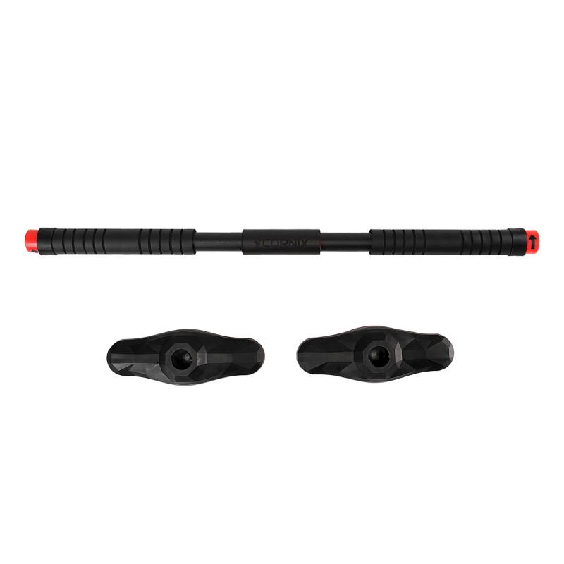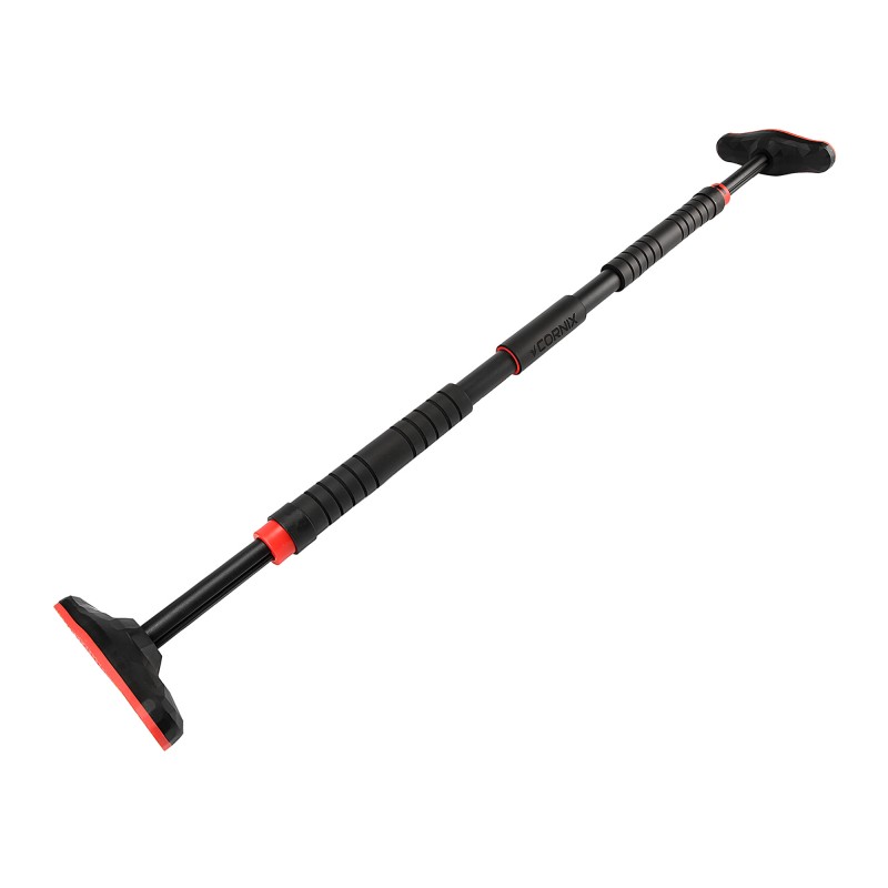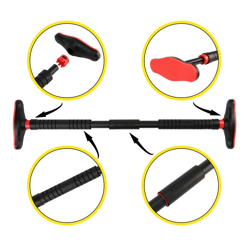 Турнік від Cornix складається з 3-ох секцій, що виконані з високоякісної стальної труби, центральна має товщину стінок - 1.5 мм, а бокові - 1.2 мм. Завдяки високому запасу міцності, конструкція розрахована на користувачів до 150 кг. Широкий діапазон регулювання довжини перекладини, робить її придатною для встановлення на більшість дверних коробок та ніш між стінами. Запатентований різьбовий механізм, що знаходиться в середині конструкції, надзвичайно чіткий у роботі та довговічний. Шляхом обертання секцій, перекладина видовжується та надійно фіксується у визначеному місці. Задля запобігання прокручуванню турніка під час тренувань, секції блокуються замками безпеки.