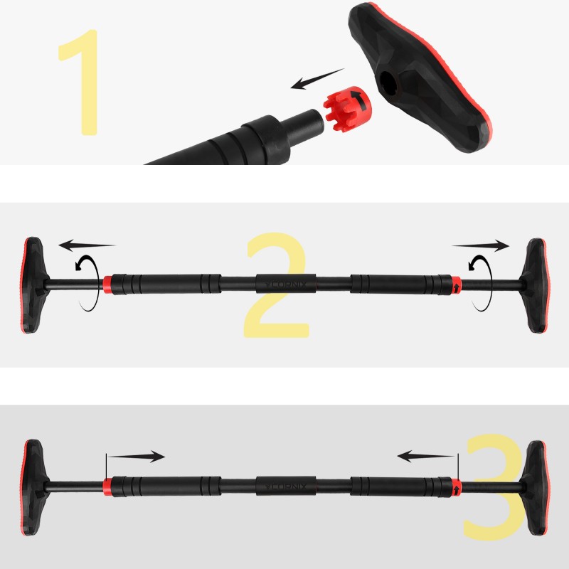 Турнік від Cornix складається з 3-ох секцій, що виконані з високоякісної стальної труби, центральна має товщину стінок - 1.5 мм, а бокові - 1.2 мм. Завдяки високому запасу міцності, конструкція розрахована на користувачів до 150 кг. Широкий діапазон регулювання довжини перекладини, робить її придатною для встановлення на більшість дверних коробок та ніш між стінами. Запатентований різьбовий механізм, що знаходиться в середині конструкції, надзвичайно чіткий у роботі та довговічний. Шляхом обертання секцій, перекладина видовжується та надійно фіксується у визначеному місці. Задля запобігання прокручуванню турніка під час тренувань, секції блокуються замками безпеки.