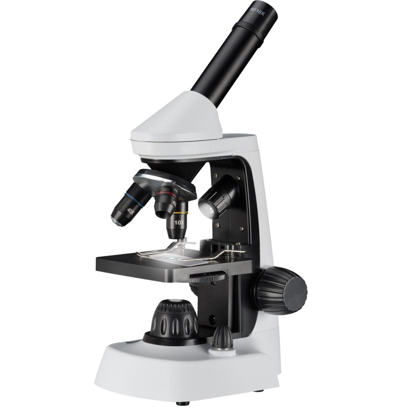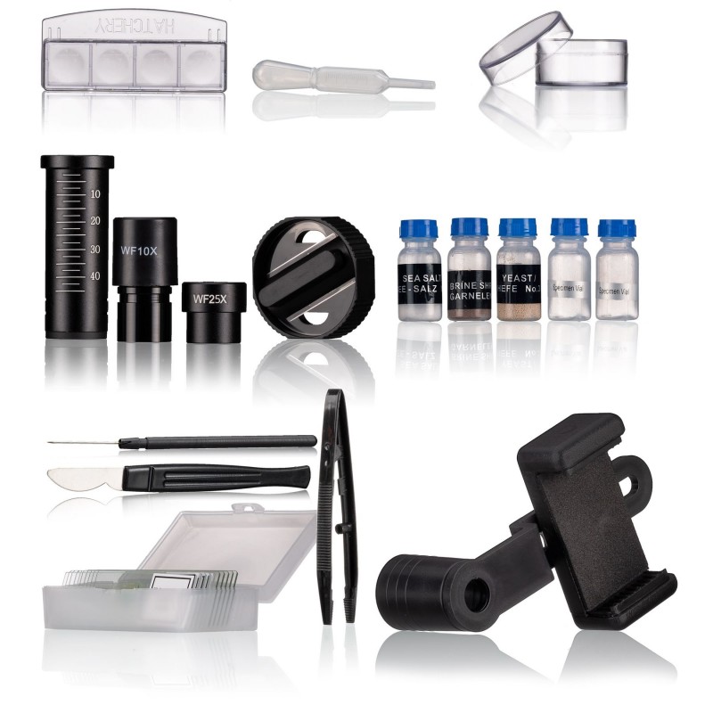 Мікроскоп Bresser Junior 40x-2000x (8855500) - це мікроскоп для вивчення готових мікропрепаратів та інших біологічних зразків будь-якого ступеня прозорості. Він підійде не тільки дорослим, але й дітям. Мікроскоп простий в управлінні, підходить для виконання шкільних робіт з біології та студентських досліджень. Також він може використовуватися для базових лабораторних спостережень. Великий діапазон плавної зміни збільшень від 40х до 2000х забезпечить точний підбір необхідного збільшення для спостереження різних зразків з достатньою чіткістю та якістю зображення. Дана модель яляется ідеальним набором для старту спостережень структури організмів, тканин і неорганічних тіл, а головне мікроскоп в даній комплектації не вимагає додаткових витрат на придбання набору аксесуарів. Мікроскоп від початку готовий до використання. У мікроскопі встановлена монокулярная насадка і револьверний пристрій на три об'єктива. Монокулярная насадка нахилена під кутом 45° і має поворот навколо вертикальної осі на 360°, що безумовно зручно для спостережень. Комбінація двох ширококутних окулярів і трьох об'єктивів дає можливість отримати збільшення 1000х. Досить корисним і цікавим є використання в підлітковому мікроскопі лінзи Барлоу з дворазовим збільшенням для отримання безступневого (плавного) зуммування зображення, завдяки чому досягається максимальне збільшення 2000х. Великий набір оптичних аксесуарів дозволяє розширити діапазон збільшень і зробити спостереження більш глибокими та цікавими. Предметний столик забезпечений металевими зажимами для фіксування мікропрепаратів. Світлодіодне підсвічування складається з верхнього і нижнього освітлювачів, яскравість яких можна регулювати. Світлодіоди забезпечують підсвічування препарату прохідним та відбитим світлом. Прохідне світло використовується для спостереження прозорих об'єктів, відбите - для непрозорих тривимірних. Використання двох ламп одночасно може бути корисно при спостереженні напівпрозорих зразків. Підсвічування регулюється плавно за допомогою реостата. Для роботи підсвічування застосовуються стандартні батарейки, які треба придбати окремо. У комплектацію входить адаптер для камери смартфона. Адаптер кріпиться на тубусі мікроскопа і дозволяє проводити фото і відеозйомку основною камерою гаджета, надійно його фіксуючи. Живлення мікроскопа здійснюється від трьох найпоширеніших батарей АА. Таким чином мікроскоп незалежний від мережі змінного струму і може бути використаний навіть в польових умовах. Перелік аксесуарів включає готові слайди, до огляду яких можна приступити негайно. Також в наборі є аксесуари для препарування зразків, мікротом для самостійного приготування зразків, інкубаторій і препарати для самостійного приготування.