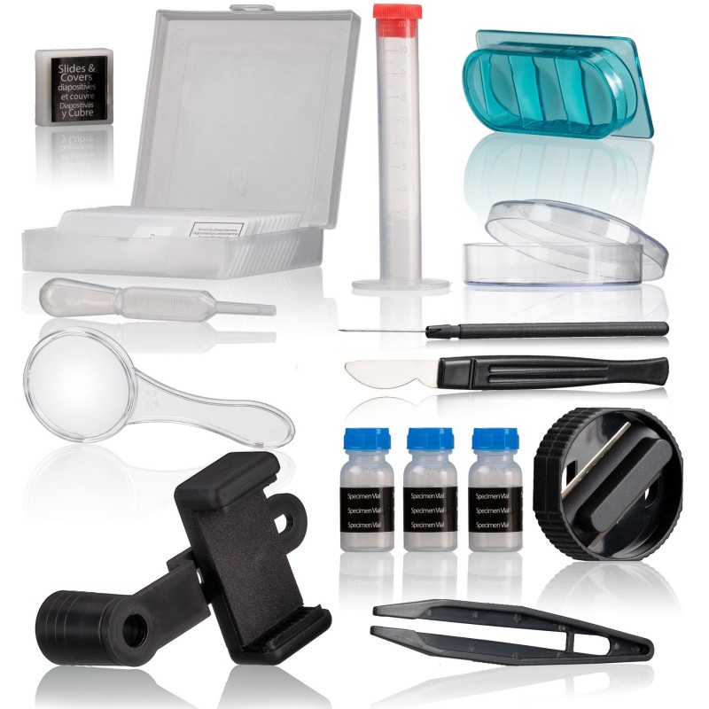 Мікроскоп Bresser Junior 40x-640x з набором для дослідів і адаптером для смартфона (8856000) є сучасним мікроскопом для дитячого розвитку. Мікроскоп укомплектований великою кількістю різноманітних аксесуарів, готових слайдів для перегляду, оснащений револьверною головкою з трьома об'єктивами, що дають у комплексі із зум-окуляром збільшення до 640х. Оскільки ця модель поставляється з широким набором аксесуарів - це дозволяє без зволікань приступити до досліджень у домашніх умовах без додаткових витрат часу та грошей. Збільшення мікроскопа формується трьома об'єктивами, зум-окуляром і сягає 640 крат. Рекомендується почати спостереження з об'єктива мінімальної кратності, встановивши зум-окуляр на мінімальну кратність. таким чином буде досягнуто кращої якості зображення. При необхідності - міняйте об'єктиви та положення зум-окуляра, домагаючись більшого збільшення. Підсвічування препарату здійснюється світлодіодним освітлювачем, що забезпечує достатню яскравість і більш правильне перенесення кольорів. Для живлення підсвічування надовго вистачає двох батарей типу АА, що не обмежує використання мікроскопа у польових умовах. Монокулярна насадка нахилена під кутом 45º, що відповідає більш природному положенню під час спостереження. Діафрагма з різними отворами дозволяє направити потрібну кількість світла на зразок. в залежності від використовуваного об'єктиву. Німецька компанія Bresser представляє широкий асортимент лабораторної оптики, призначеної для користувачів різного віку та навичок, починаючи від найменших і закінчуючи професійними лаборантами медичних та виробничих лабораторій.