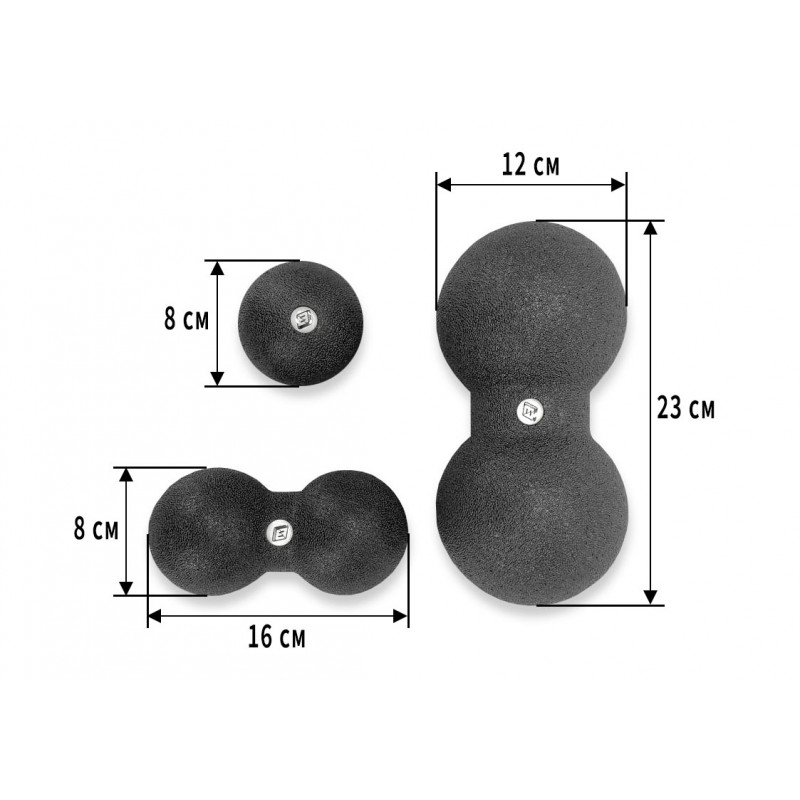 - М'ячик діаметром 23х12 см - масажний м'яч подвійний ідеально підходить для опрацювання великих груп м'язів, таких як спина, стегна та сідниці. Його розміри дозволяють глибоко опрацювати м'язи та зняти напругу.