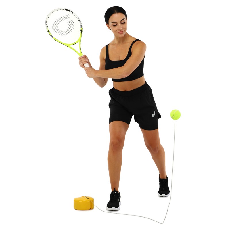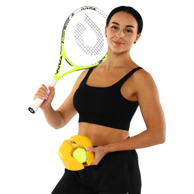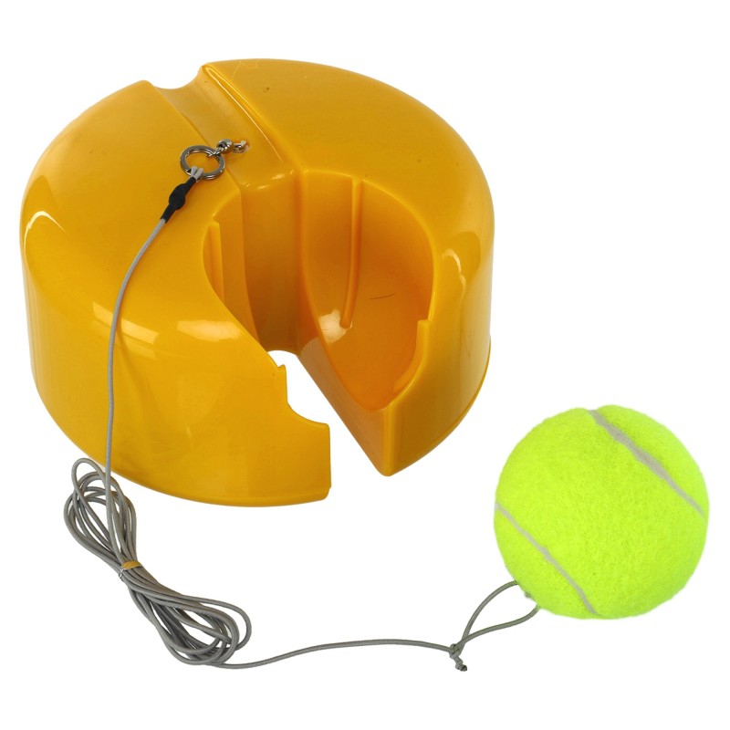 Тренажер включає м'яч на еластичному шнурку, що кріпиться до міцної бази. Еластичний шнурок довжиною 1,6 метра забезпечує оптимальну відстань для комфортного тренування, а мотузок завдовжки 4 метри дозволяє регулювати амплітуду та силу удару, що важливо для різних рівнів інтенсивності тренувань. База діаметром 16 см та висотою 8,5 см виготовлена з міцного поліпропілену (PP), що робить її легкою, стійкою та довговічною. У комплекті поставляється один гумовий м'яч із повстяною поверхнею, який імітує стандартний тенісний м'яч, забезпечуючи реалістичні відчуття під час тренування.
