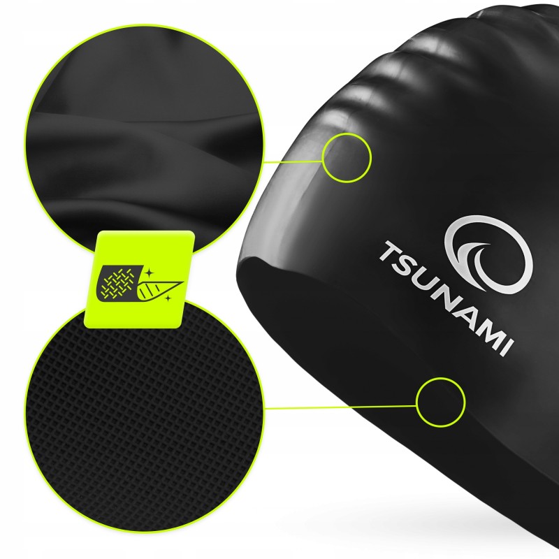 Шапочка для плавання від Tsunami виконана з еластичного матеріалу - силікону. Гладка поверхня мінімізує опір води, забезпечуючи плавність рухів під час плавання, що виливається в ключовий параметр - вашу швидкість. Внутрішня текстура запобігає зісковзуванню шапочки та висмикуванню волосся. Адже саме це зазвичай приносить найбільший дискомфорт. Для того, щоб безболісно одягнути аксесуар, перш за все необхідно зняти всі шпильки та прикраси. Потім засуньте обидві руки всередину, розтягніть матеріал та почніть надягати шапку, спочатку на лоб, а тоді на решту голови. Переконайтеся, що шапочка сидить рівномірно та зручно, потім натягніть її на вуха, щоб захистити їх від води. Якщо у вас довге волосся, можна акуратно змочити його водою та зав'язати у хвіст. Далі шапочка одягається починаючи з потилиці, а тоді натягується на всю голову.