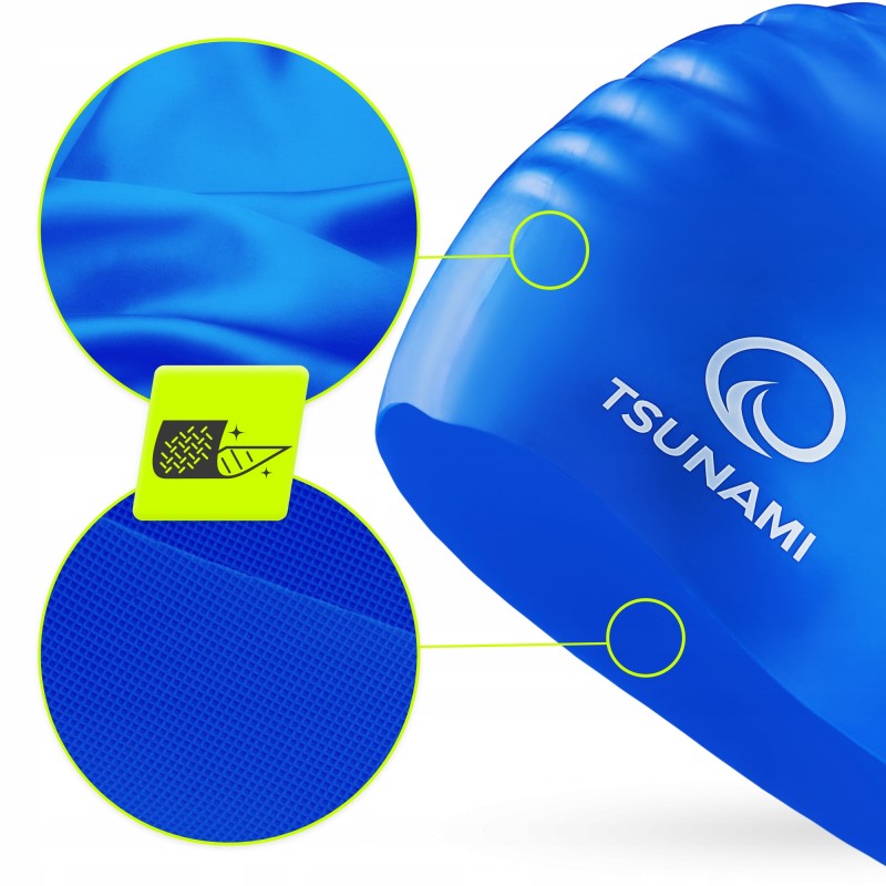 Шапочка для плавання від Tsunami виконана з еластичного матеріалу - силікону. Гладка поверхня мінімізує опір води, забезпечуючи плавність рухів під час плавання, що виливається в ключовий параметр - вашу швидкість. Внутрішня текстура запобігає зісковзуванню шапочки та висмикуванню волосся. Адже саме це зазвичай приносить найбільший дискомфорт. Для того, щоб безболісно одягнути аксесуар, перш за все необхідно зняти всі шпильки та прикраси. Потім засуньте обидві руки всередину, розтягніть матеріал та почніть надягати шапку, спочатку на лоб, а тоді на решту голови. Переконайтеся, що шапочка сидить рівномірно та зручно, потім натягніть її на вуха, щоб захистити їх від води. Якщо у вас довге волосся, можна акуратно змочити його водою та зав'язати у хвіст. Далі шапочка одягається починаючи з потилиці, а тоді натягується на всю голову.