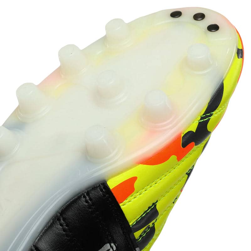 Підошва виконана з термополіуретану (TPU), який надає відмінну гнучкість та амортизацію. Матеріали відомий своєю міцністю та стійкістю до зносу, що особливо важливо для футбольних бутс, що зазнають значних навантажень. Підошва має продуману конструкцію шипів, які рівномірно розподілені по всій поверхні. Це сприяє надійному зчепленню з натуральним газоном та відмінною стійкістю на трав'яних покриттях. Шипи розміщені у стратегічно важливих точках для забезпечення оптимального зчеплення та мінімізації ризику ковзання, що дозволяє гравцям впевнено виконувати різкі повороти та швидкі рухи. Фіксується модель за допомогою шнурків, що дозволяє індивідуально підлаштовувати їх під форму стопи.