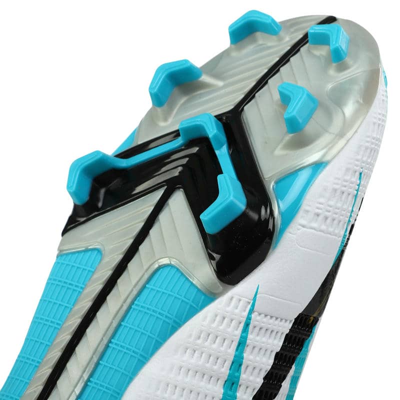 Підошва виконана з термополіуретану (TPU) і оснащена шипами, спеціально призначеними для гри на натуральному газоні. TPU – це матеріал, який поєднує в собі легкість та міцність, що робить підошву стійкою до стирання та впливу навколишнього середовища, одночасно гарантуючи гарне зчеплення з поверхнею. Шипи на підошві гарантують надійне утримання на траві, запобігаючи ковзанню та допомагаючи гравцям зберігати стійкість при швидких маневрах та різких поворотах.