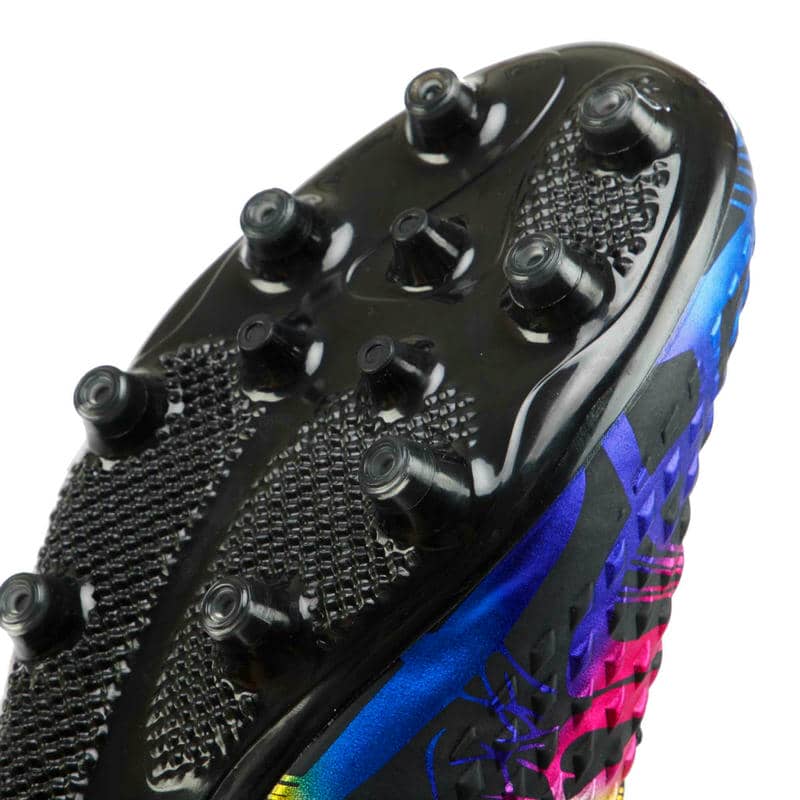 Підошва виконана з термополіуретану (TPU) і оснащена шипами, спеціально призначеними для гри на натуральному газоні. TPU – це матеріал, який поєднує в собі легкість та міцність, що робить підошву стійкою до стирання та впливу навколишнього середовища, одночасно гарантуючи гарне зчеплення з поверхнею. Шипи на підошві гарантують надійне утримання на траві, запобігаючи ковзанню та допомагаючи гравцям зберігати стійкість при швидких маневрах та різких поворотах.