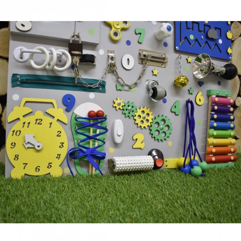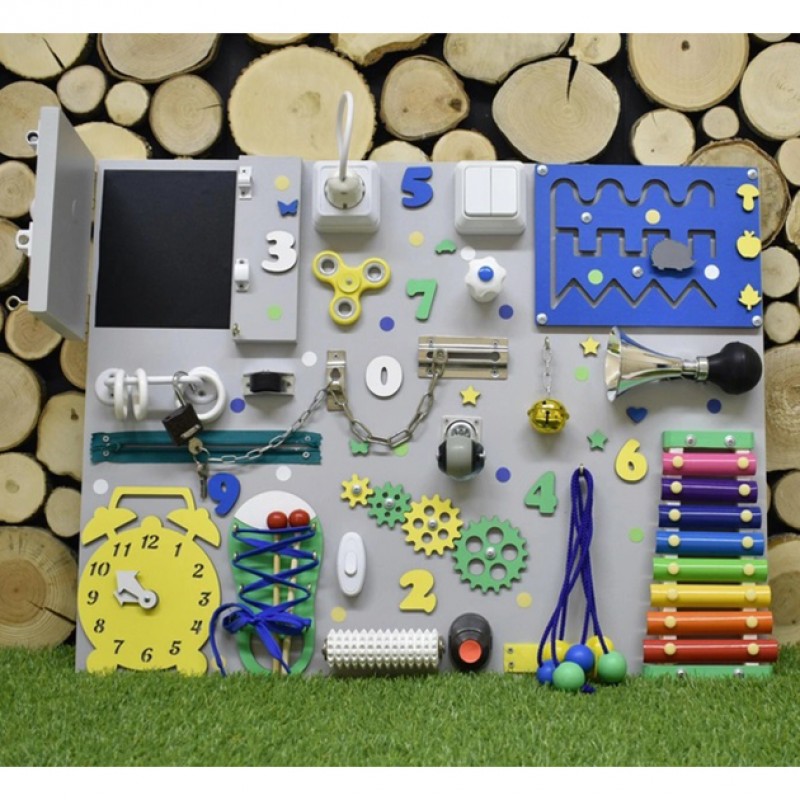 На ігрові поля бізібордів прикріплюються всілякі предмети та дрібні елементи, які допоможуть дитині швидше освоїтися в навколишньому світі та навчитися правильно користуватися побутовими предметами: ланцюжки, замочки, муляжі розеток та вимикачів, годинники, шнурки, спіннери, ксилофон, лабіринти. Бізіборд підійде, як малюкам - просто посмикати, повивчати, так і старшим дітям - більш складні замки, вивчення цифр і часу.