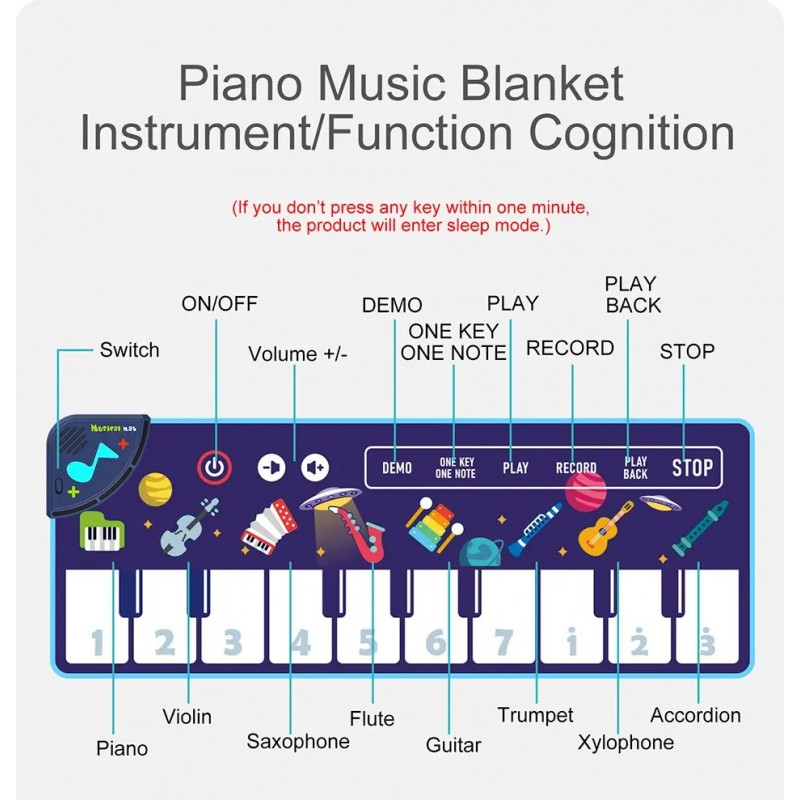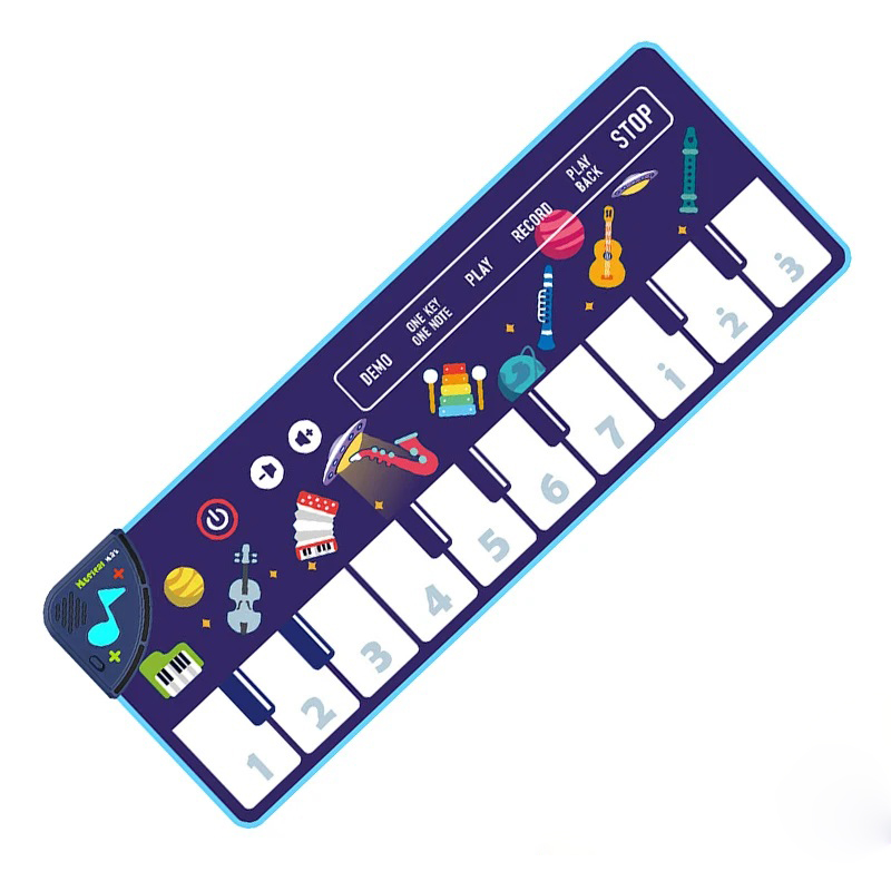 Музичний килимок приверне увагу дитини барвистим оформленням та своїм функціоналом. Призначений для формування рухової активності дітей, для розвитку кординації рухів і пізнавальних процесів: сприйняття, уваги, мислення, пам'яті, концентрації. Допоможе розпізнавати звуки музичних інструментів: фортепіано, скрипка, флейта, саксофон, гітара, труба, ксилофон, акордеон. Також знімає стрес та покращує настрій.