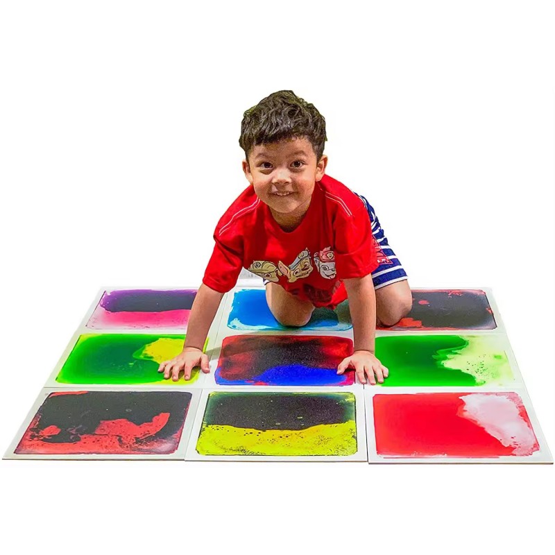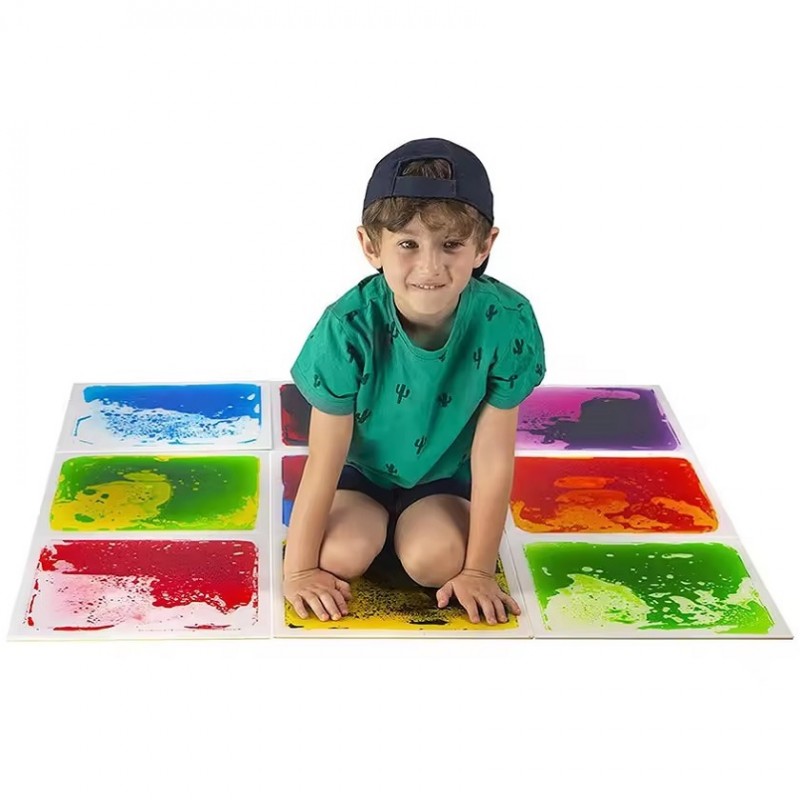 Рідкий килимок Монтессорі - підлогове покриття, яке можна використовувати як танцпол, дитячий ігровий килимок, спортивний килимок, декоративної підлогової плитки для будинку і навіть для виставкового залу. Модульна плитка виготовлена ​​з двох листів ПВХ, усередині виробу безпечна косметична рідина, яка починає рухатися з кожним кроком, стрибком або танцем, що створює гарний ефект. Спеціальний полімерний матеріал стійкий до стирання та ковзання, що забезпечує безпечну експлуатацію.