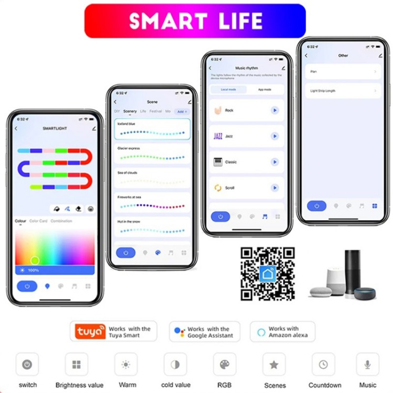 Керувати світлодіодною різнокольоровою стрічкою можна зі смартфона за допомогою програми та підключення до Wi-Fi. Сумісна з голосовим керуванням, працює з Alexa, Google Home Assistant, ви можете керувати стрічкою голосом, просто потрібно дати голосову команду, щоб увімкнути/вимкнути або збільшити/зменшити яскравість. Також керувати світлодіодною стрічкою можна дистанційно, незалежно від того, чи Ви знаходитесь вдома. Вам просто потрібно завантажити програму Smart Life або Tuya Smart і підключити стрічку через Wi-Fi. Має функцію освітлення із синхронізацією музики (підсвічування буде світитися в ритмі музики/навколишнього звуку)