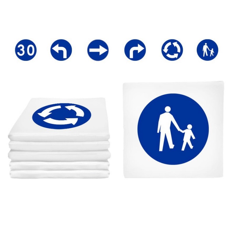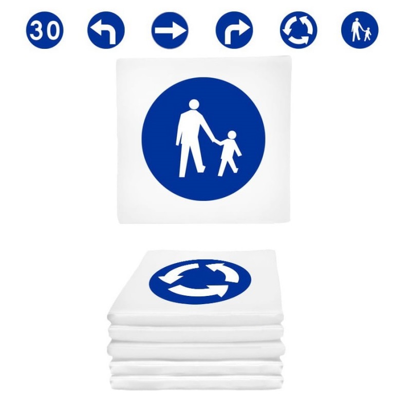 Для дітей такого роду комплекти є місцем для сидіння під час навчальних занять у студіях раннього розвитку та дитячих садках. Нанесені на сидіння зображення Операційних Знаків ПДР сприяють їх вивченню та служать інструментом навчальних та розважальних ігор. Це ідеальний інструмент для командних ігор як у приміщенні, так і на вулиці. Подушки наповнені поролоном, що робить їх зручними, легкими та безпечними.