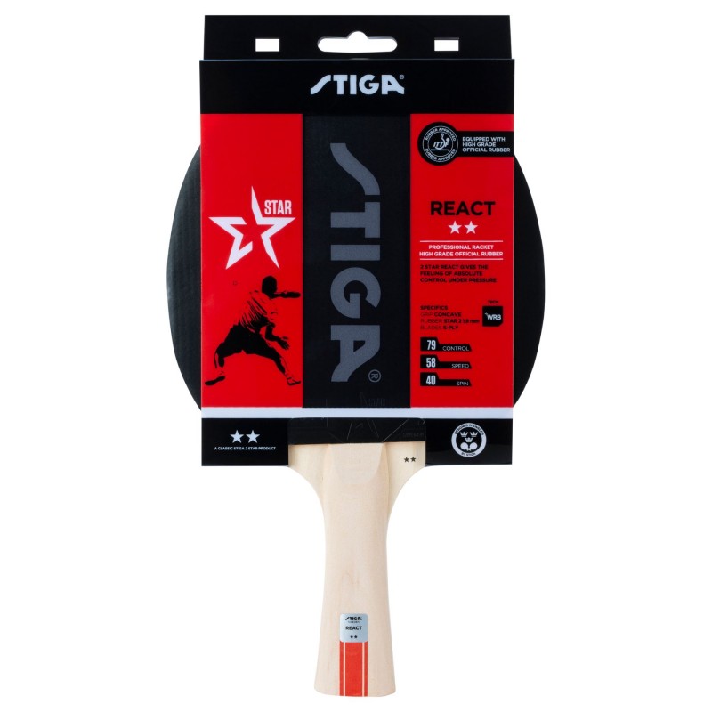 Stiga React — це 2-зіркова ракетка для настільного тенісу, яка надає гравцям з універсальним стилем гри відчуття повного контролю. 5-шарове лезо з увігнутою ручкою для зручного утримання та 2-зірковою гумою з губкою 1,9 мм. Технологія WRB означає, що біта для настільного тенісу забезпечує більшу швидкість при ударі м'яча.