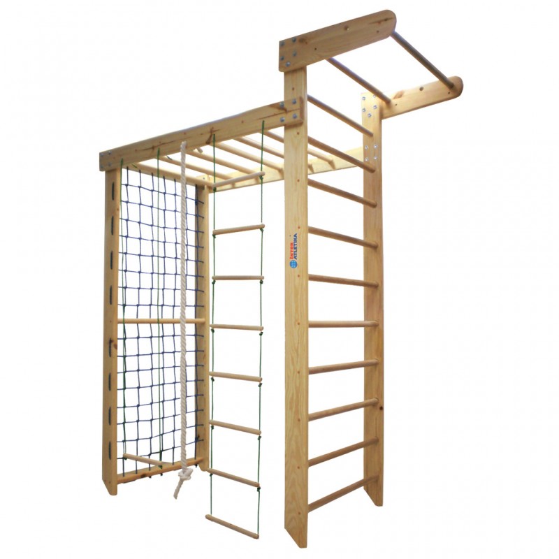 Спортивний комплекс InterAtletika (ST-026.4) з рукохідом виготовлений з масиву сосни високої якості, всі деталі ретельно оброблені та не містять шороховатостей, покриті декількома шарами безпечного лаку без запаху, що збільшує термін служби спорткомплексу, всі видимі гвинти закриті заглушками. Застосування букових перекладин дозволяє витримувати навантаження до 100 кг. А елементи мотузкового набору можна розмістити як на бічних поверхнях рукохіду з будь-якого боку комплексу, так і на верхньому турніку.