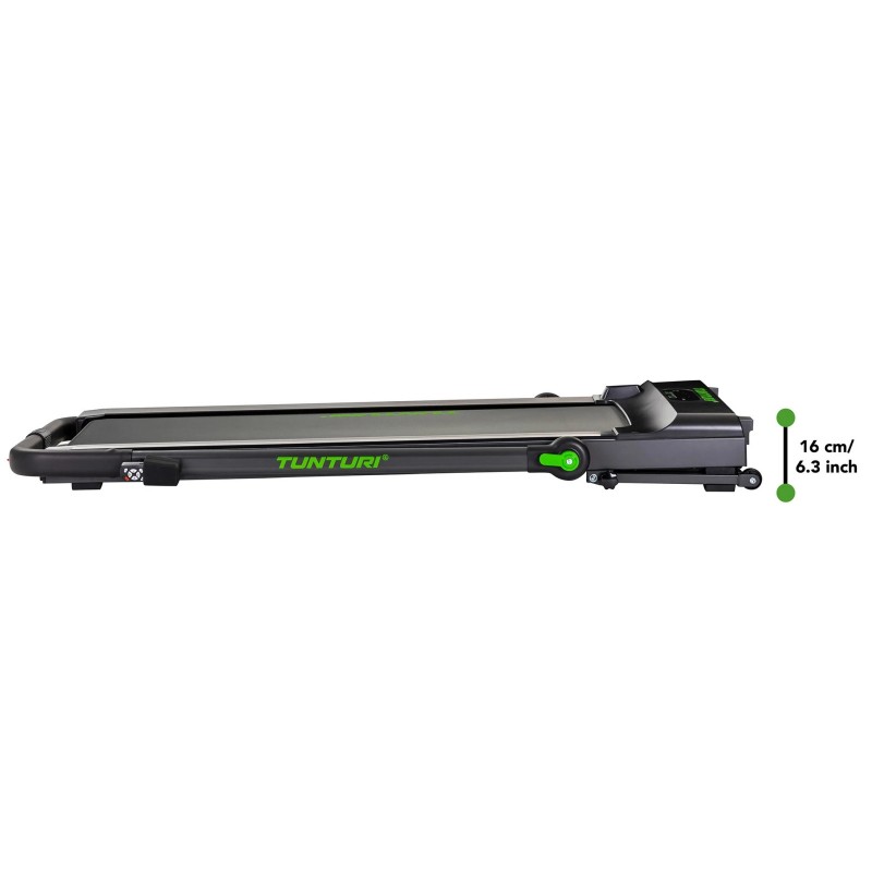 Прогулянкова дошка Tunturi Cardio Fit T10 характеризується надзвичайно компактним дизайном, що робить її ідеальним рішенням для квартир і невеликих приміщень. У складеному вигляді його висота становить всього 16 см, що дозволяє легко заховати бігову доріжку під ліжком, в шафі або за дверима, не займаючи дорогоцінного місця в будинку.