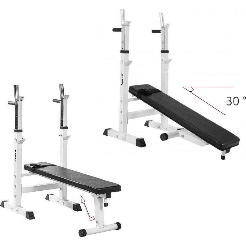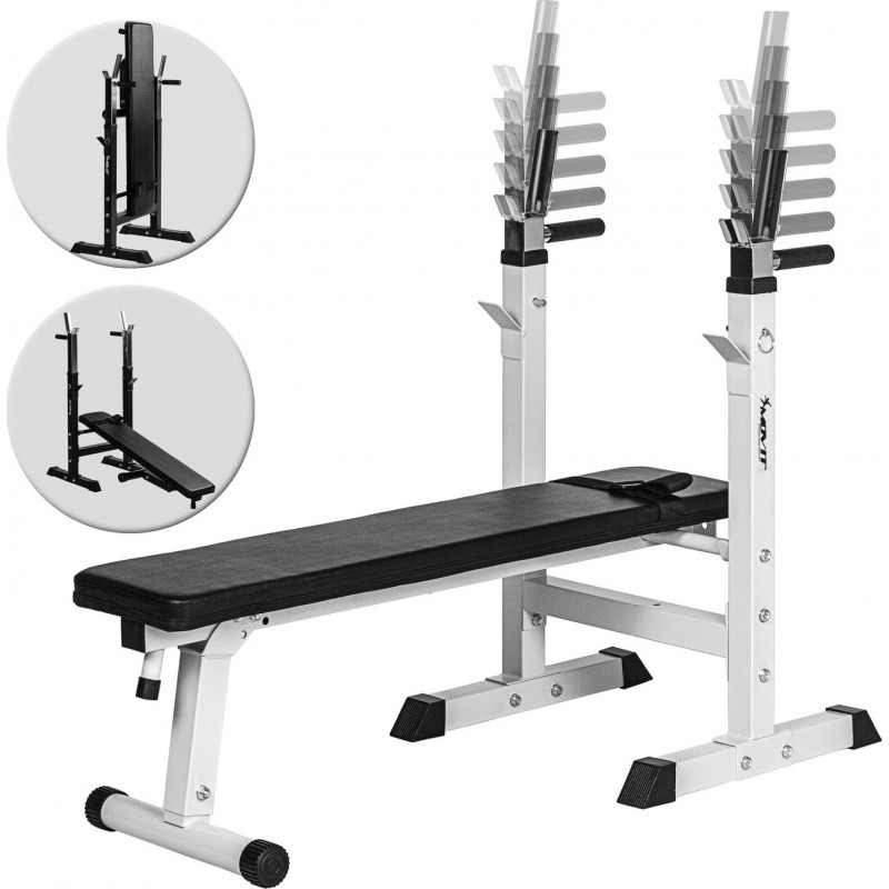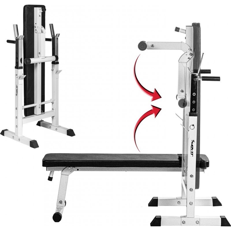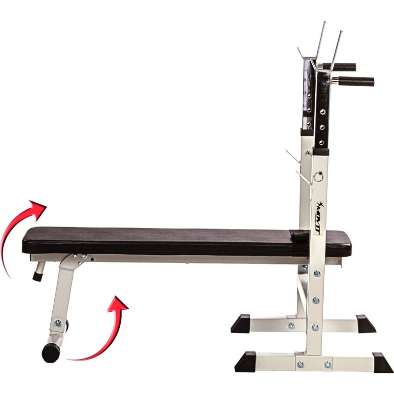 Тренувальна лава 3 в 1 (лава + стійка для штанги + тримачі для занурення) німецького бренду Movit®. Має п'ятиступеневе регулювання висоти підставок і двоступеневе регулювання кута нахилу сидіння. Завдяки складаним ніжкам, тренажерну лаву також можна використовувати як похилу лаву для кранча, разом із ременем для ніг, який запобігає згинанню ніг під час виконання вправ, підвищуючи їх ефективність. Товсте зручне сидіння зробить тренування більш комфортними. Після тренування ви можете скласти його та заощадити місце у вашому домашньому тренажерному залі. Лава покращить ваш загальний фізичний стан і допоможе досягти поставленої мети, незалежно від вашого рівня розвитку.