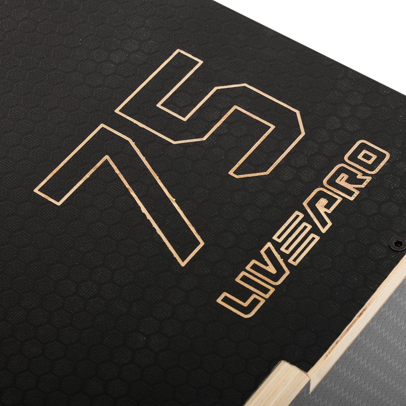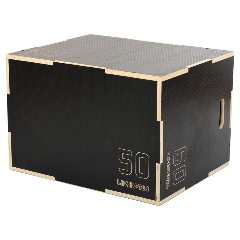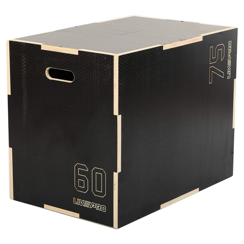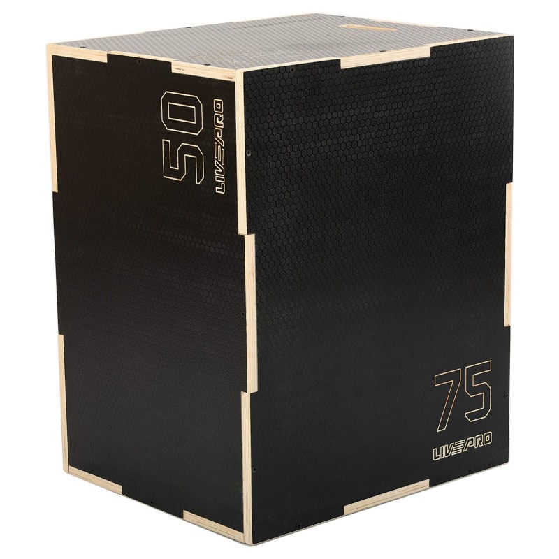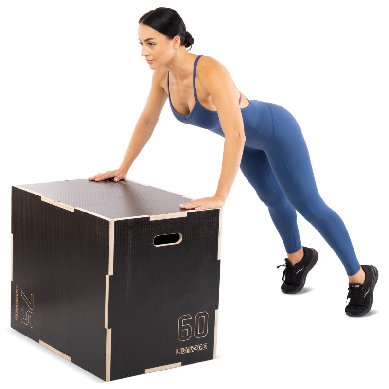 Plyo box 3-in-1 LiveUp - це вдосконалена модель від відомого виробника спортивного інвентарю. Пліометричний бокс являє собою дерев'яний ящик для стрибків, що має три варіанти висоти. Його легко перевернути, залежно від положення спортсмен отримує висоту 50/60/75 см. Бокс виготовлено з березової деревини завтовшки 18 мм, усередині конструкції розташовано три дошки в положенні хрест-навхрест, що забезпечують міцність конструкції. Ящик витримує навантаження до 200 кг, стійкий до деформацій і надійний. Покриття з текстурою у вигляді сот не ковзає. З боків коробки розташовані зручні прорізні ручки для транспортування пліобокса.