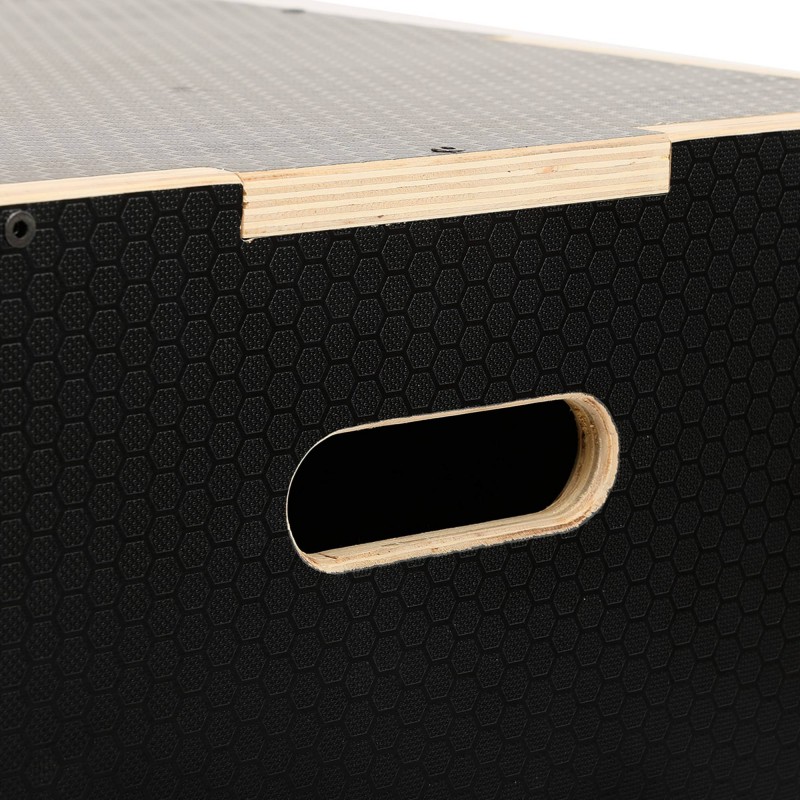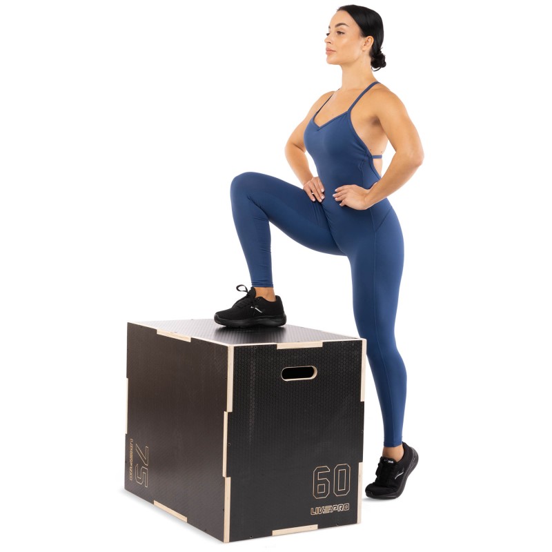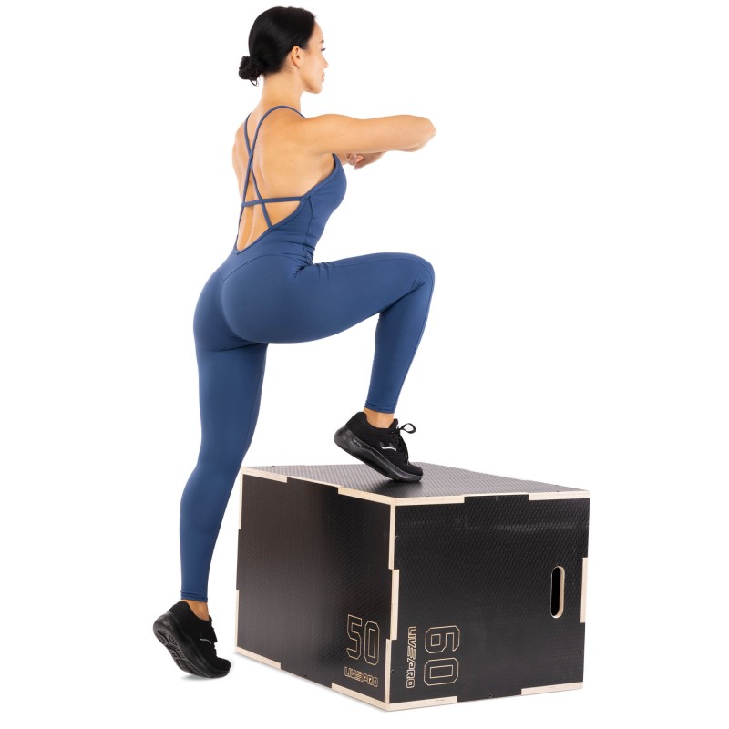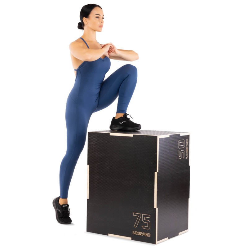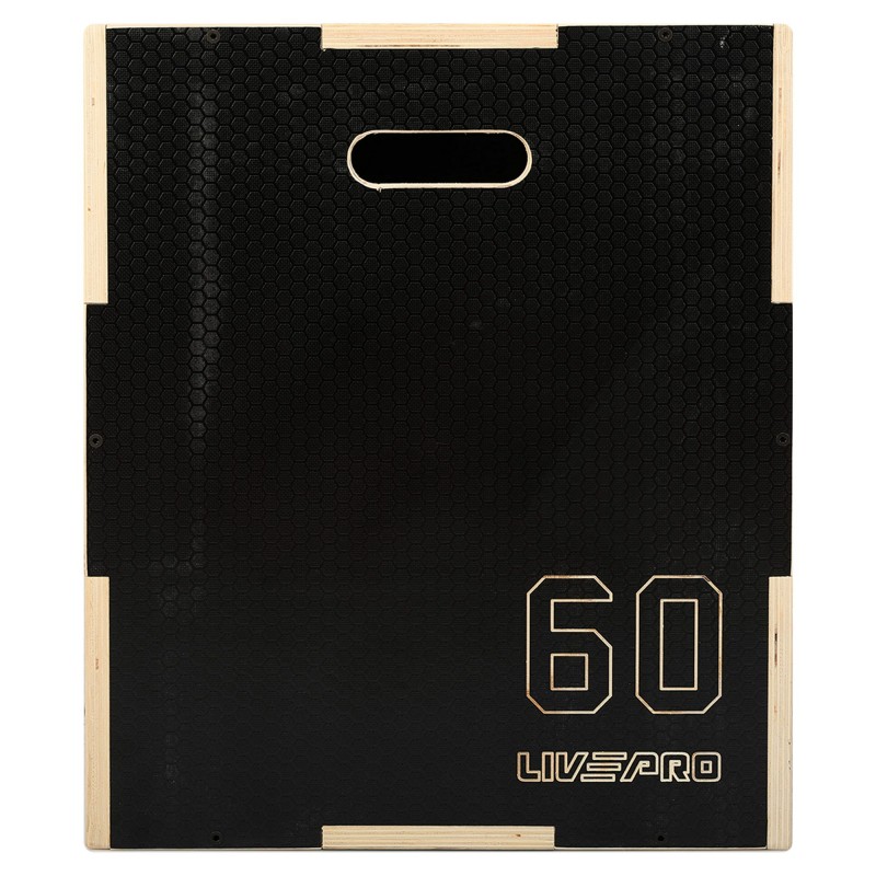 Plyo box 3-in-1 LiveUp - це вдосконалена модель від відомого виробника спортивного інвентарю. Пліометричний бокс являє собою дерев'яний ящик для стрибків, що має три варіанти висоти. Його легко перевернути, залежно від положення спортсмен отримує висоту 50/60/75 см. Бокс виготовлено з березової деревини завтовшки 18 мм, усередині конструкції розташовано три дошки в положенні хрест-навхрест, що забезпечують міцність конструкції. Ящик витримує навантаження до 200 кг, стійкий до деформацій і надійний. Покриття з текстурою у вигляді сот не ковзає. З боків коробки розташовані зручні прорізні ручки для транспортування пліобокса.