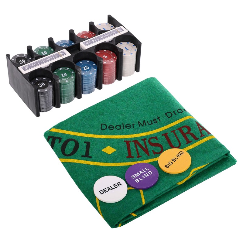 У комплект входить 200 фішок, кожна з яких важить 4 грами та має діаметр 39 мм, що відповідає стандартам покерних фішок. Це дозволяє поринути в атмосферу гри, максимально близьку до професійної. Для зручності та комфорту учасників передбачено два блайнди та спеціальний маркер дилера, що спрощує ведення гри.