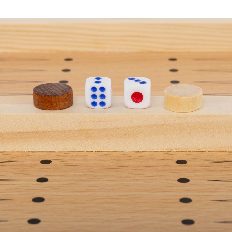 Шахові фігури, виконані у традиційному дизайні, забезпечують класичну атмосферу гри. У комплект входять 16 білих та 16 чорних фігур, кожна з яких точно підігнана під ігрове поле. Для шашок та нард передбачено по 15 білих та 15 чорних фігур, а також дві гральні кістки, що додають азарт нардової партії.