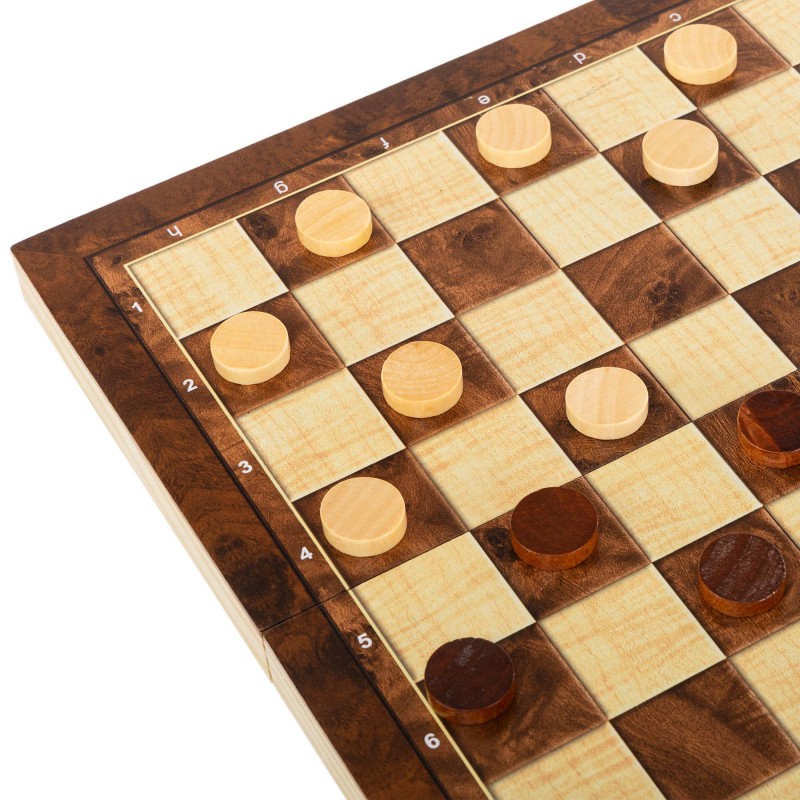 Шахи представлені традиційними фігурами: 16 білих та 16 чорних. Їхній класичний дизайн допомагає зосередитися на грі і легко розрізняти фігури. Шашки та фішки для нард виконані в білому та чорному кольорах (по 15 фігур кожного кольору), що робить набір гармонійним та зручним. Для гри в нарди в комплект входять дві гральні кістки, які додають азарт та елемент випадковості.