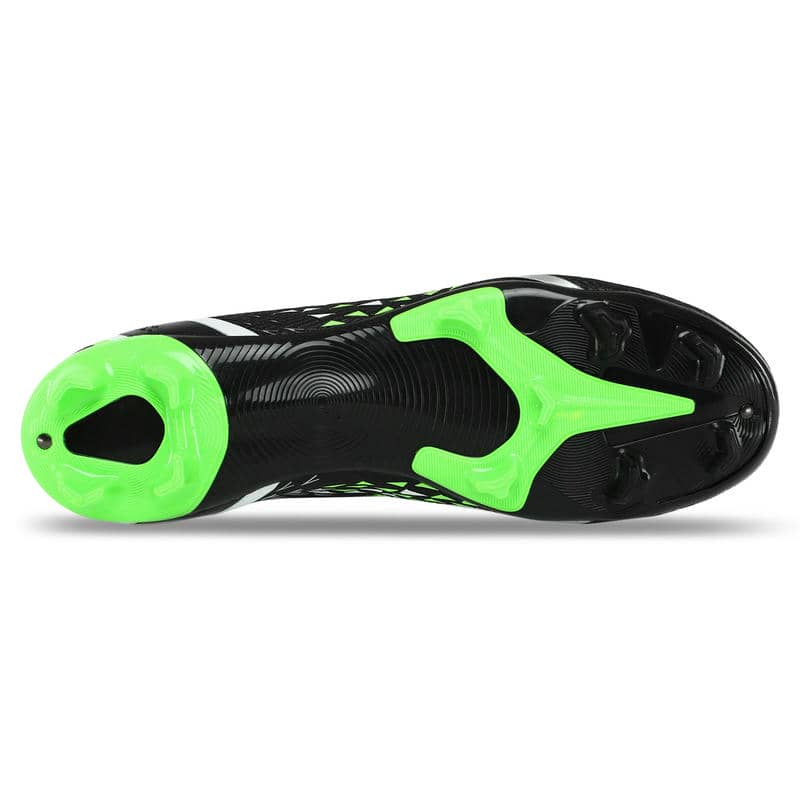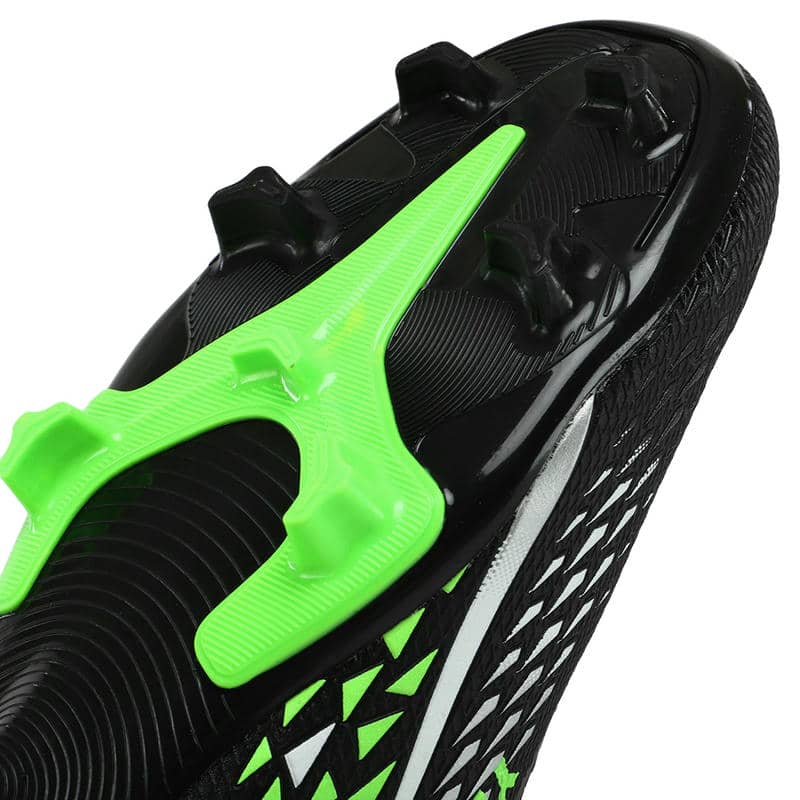 Підошва з термополіуретану (TPU) відрізняється високою міцністю і пружністю, що сприяє відмінному зчепленню з натуральним газоном і запобігає ковзанню. Конструкція підошви включає стратегічно розташовані шипи, які покращують зчеплення та маневреність. Ці шипи розміщені так, щоб забезпечити рівномірний розподіл навантаження та підтримувати стабільність при різких поворотах та зміні напрямку. Це робить бутси особливо зручними при виконанні швидких та динамічних рухів на полі.