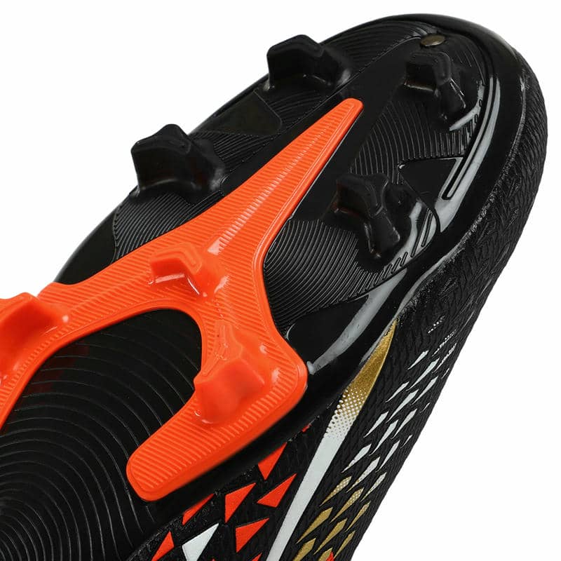 Підошва з термополіуретану (TPU) відрізняється високою міцністю і пружністю, що сприяє відмінному зчепленню з натуральним газоном і запобігає ковзанню. Конструкція підошви включає стратегічно розташовані шипи, які покращують зчеплення та маневреність. Ці шипи розміщені так, щоб забезпечити рівномірний розподіл навантаження та підтримувати стабільність при різких поворотах та зміні напрямку. Це робить бутси особливо зручними при виконанні швидких та динамічних рухів на полі.