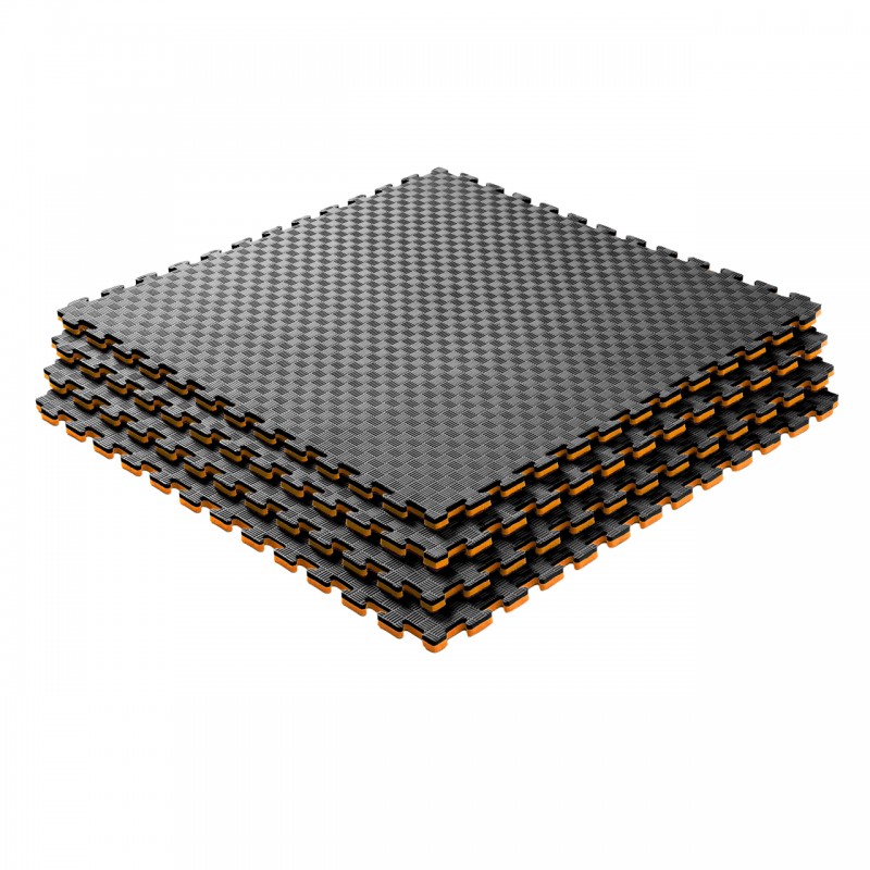 Мат Татамі 1000х1000х20мм чорний і помаранчевий – є одним з найпопулярніших та універсальних видів підлогових покриттів для дитячих майданчиків, спортивних закладів, фітнес-клубів та інших спортивних приміщень. Вони виготовляються з безпечного матеріалу на основі етиленвінілацетату (EVA/ЕВА) і мають низьку вагу та простоту у монтажі. Татамі складаються з пазлів, які легко з'єднуються між собою, що робить процес монтажу швидким та простим.