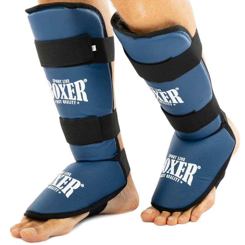 Захист гомілки та стопи BOXER - елемент екіпіровки спортсменів, які займаються єдиноборствами. Аксесуар дає змогу запобігти травмам ніг і являє собою м'які накладки ергономічної форми, що щільно прилягають до гомілки та стопи. Під час бою вони амортизують удари, пом'якшуючи їхній вплив на кістки та м'які тканини. Зовнішній шар захисту виконаний із синтетичної шкіри. Міцний і еластичний матеріал витримує великі навантаження, стійкий до утворення тріщин і розривів. Усередині знаходиться сформований пінний наповнювач. Закріпити екіпірування на нозі дозволяють широкі липучки, за допомогою яких можна максимально точно підігнати захист за розміром. Стильний і легкий аксесуар не обмежує рухливість спортсмена, дає змогу почуватися в більшій безпеці та комфорті.
