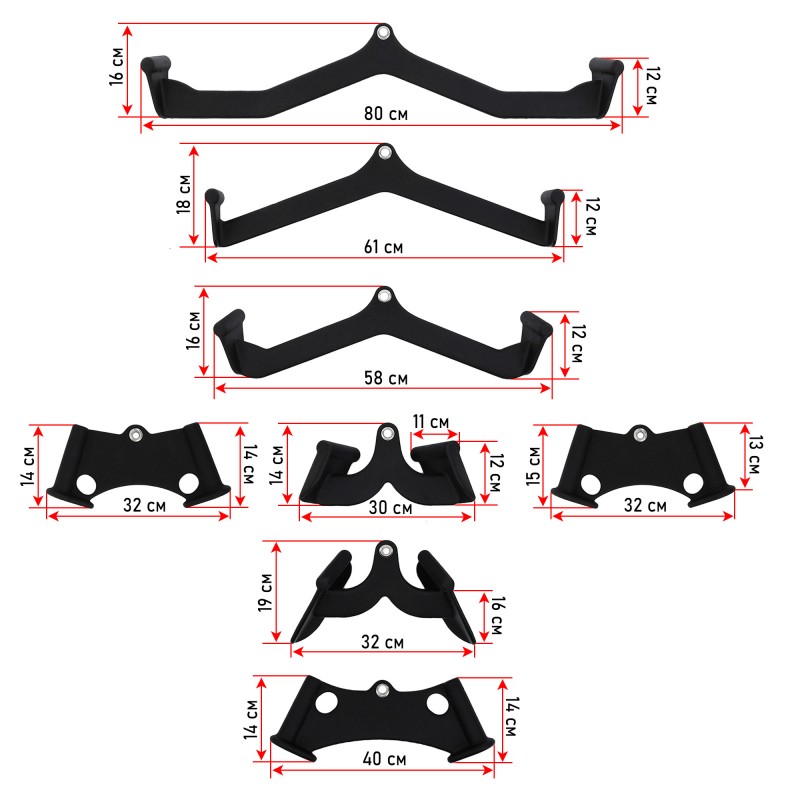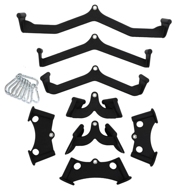 Широка рукоятка Wide Grip довжиною 80 см та шириною 16 см дозволяє комфортно виконувати тягу для опрацювання найширших м'язів спини, створюючи ідеальну V-подібну форму. Середні рукоятки (Mide Grip та Mid Grip) оптимальні для акценту на верхніх та середніх частинах трапецій, забезпечуючи комфортний хват та контроль над рухом. V-подібні рукоятки різної ширини (32 і 30 см) ідеальні для ізольованого опрацювання біцепсів та трицепсів, у той час як три рукоятки для трицепсів (T-bar) різного розміру пропонують гнучкість при виконанні розгинання.