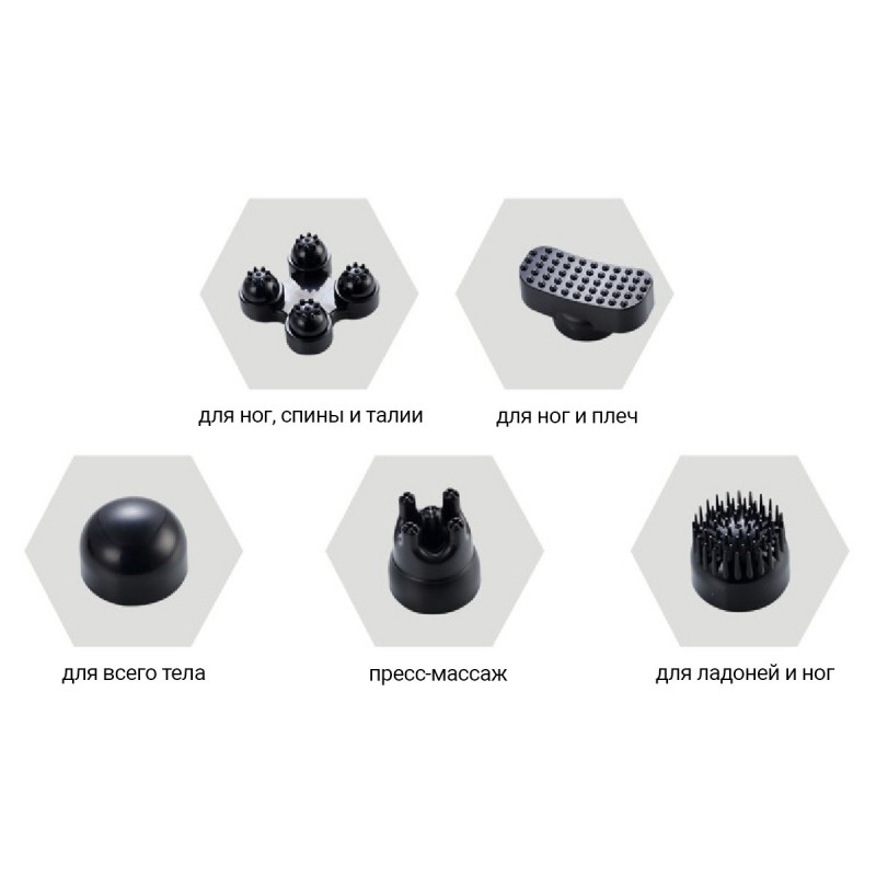 Апарат самомасажу з 5 насадками створює масажні вібрації, що проникають глибоко в м'язові тканини, завдяки чому швидко та ефективно знімає втому та стрес.