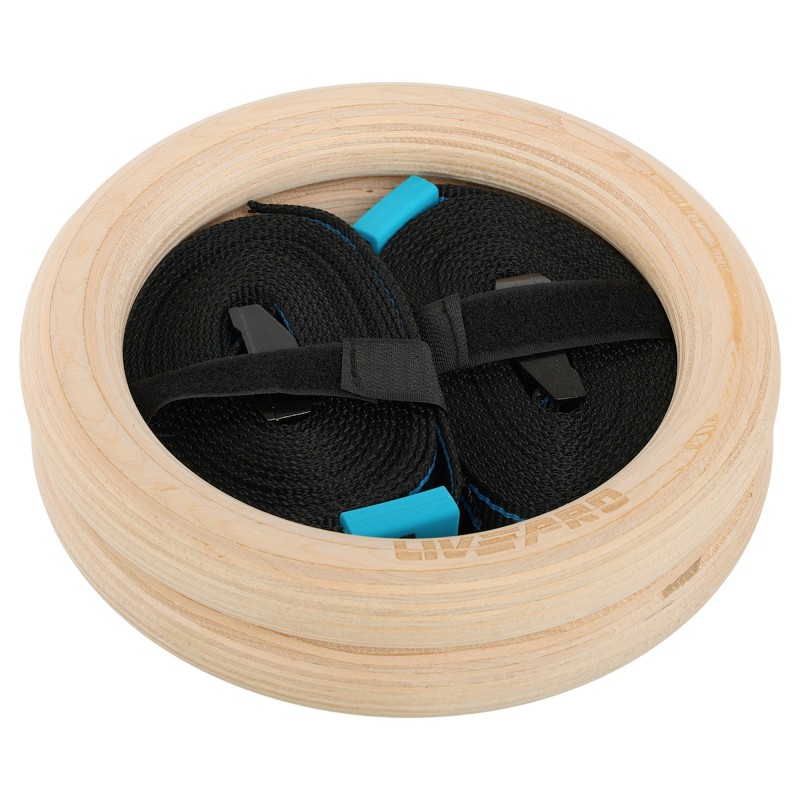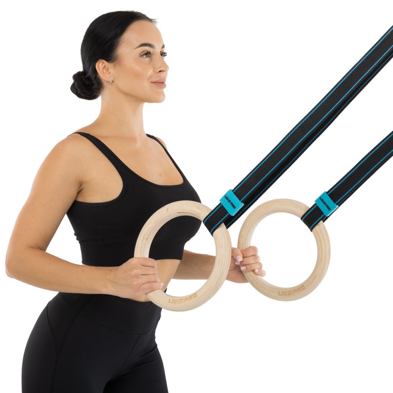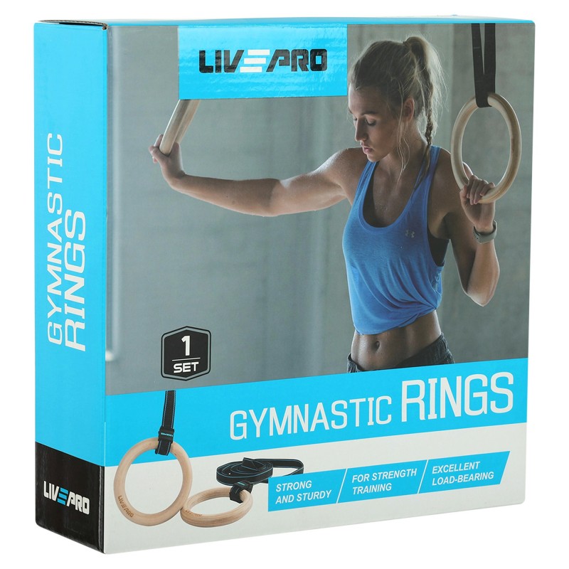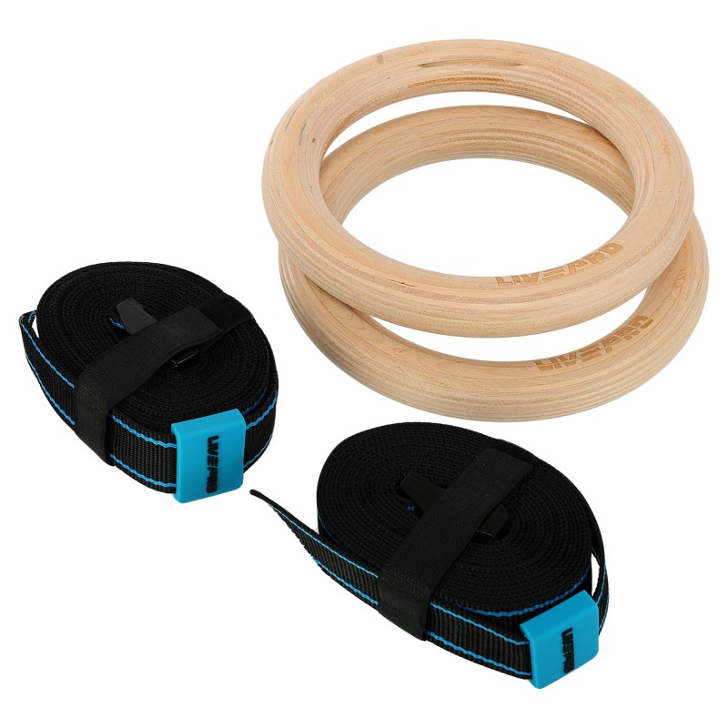 Гімнастичні дерев'яні кільця LiveUp для кросфіту виготовлені з довговічних матеріалів високої якості та здатні витримувати навантаження до 200 кг. Для виготовлення кілець використовується міцна березова деревина товщиною 32 мм. Матеріал легкий і стійкий, після ретельного шліфування та полірування ручки зберігають природну текстуру дерева, що забезпечує відмінне зчеплення з долонею. Кожне кільце комплектується міцним ременем і металевою застібкою-пряжкою. Ремінь довжиною 460 см дає змогу відрегулювати зручну висоту кілець у будь-якому приміщенні та надійно зафіксувати її за допомогою пряжки. Вага одного комплекту становить лише 1,66 кг. Гімнастичні кільця зручно зберігати та транспортувати, їх можна використовувати для тренувань у приміщенні та на вулиці.