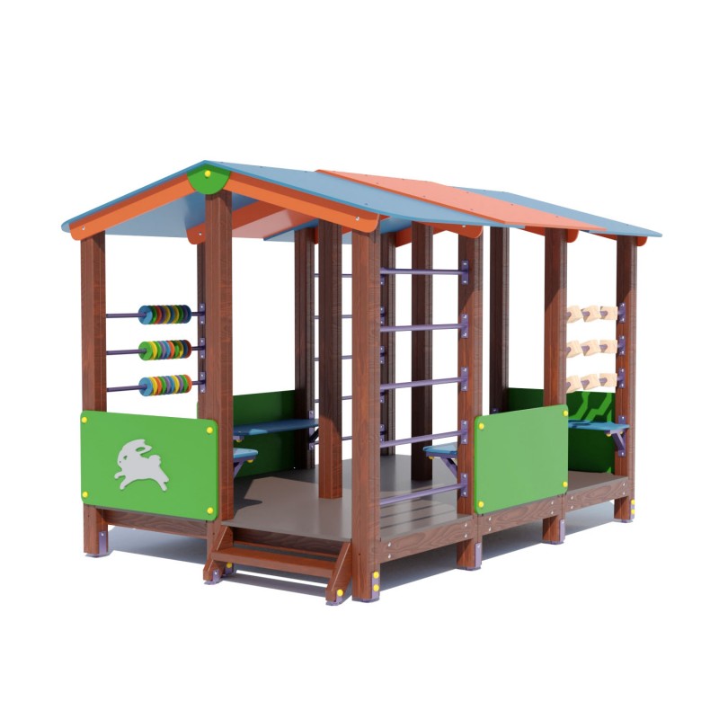 Альтанка-навіс з рахунками DIO231 – це захоплюючий ігровий елемент для дитячого майданчика, улюблений усіма дітьми, який принесе користь і радість вашій дитині. Це чудовий варіант як для приватних будинків, так і для дитячих майданчиків. Усередині альтанки-навісу є 4 лавочки з фанери, розташовані вздовж стін, що дозволяє дітям відпочивати у перервах між іграми на дитячому майданчику. Замість спинки, зовні лавочки прикріплені фанерні напівстінки. Також у альтанці є дві шведські стінки, розташовані замість двох стін. Має двосхилий фанерний дах, який чудово захищає дітей від променів сонця, а разом з фанерними стінами — і від дощу, що мрячить, і вітру.