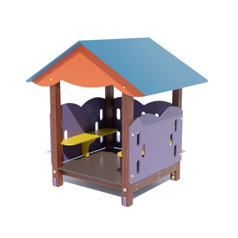 Усередині будиночка є 2 дерев'яні лавочки, розташовані вздовж стін, що дозволяє дітям відпочивати у перервах між іграми на дитячому майданчику. Має двосхилий фанерний дах, який чудово захищає дітей від променів сонця, а разом з фанерними стінами – і від дощу, що мчить, і вітру.
