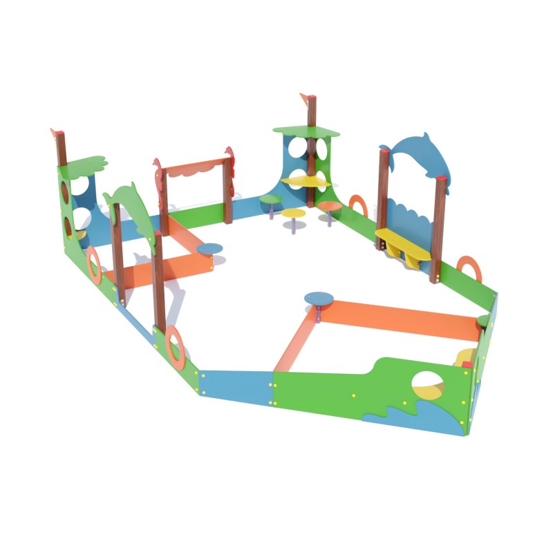 Пісочниця є невеликою територією, яка огороджена конструкцією у вигляді кораблика. Арка виконує роль стартового майданчика комплексу, зверху є декоративна вставка із вологостійкої фанери у формі дельфіна. На території є дві пісочниці, які виготовлені з вологостійкої фанери. Пісочниця, що знаходиться в носі корабля, має столик, що розташувався вздовж двох стін. Також є дерев'яна лавочка, яка знаходиться над другою аркою з декоративною вставкою у формі дельфіна. Роль спинки лави виконує фанера, яка прикріплена до зовнішньої частини арки. Праворуч однієї з пісочниць, під невеликим дахом у формі листа, розташувався кутовий столик із фанери. У комплекті зі столиком є три сидіння, виконані з фанери, яка прикріплена до металевої стійки. Біля столика є ще одна декоративна арка, на двох дерев'яних балках якої знаходяться декоративні вставки із вологостійкої фанери у формі морських ковзанів. Вся конструкція пісочниці "Кораблик" виготовлена з вологостійкої фанери.